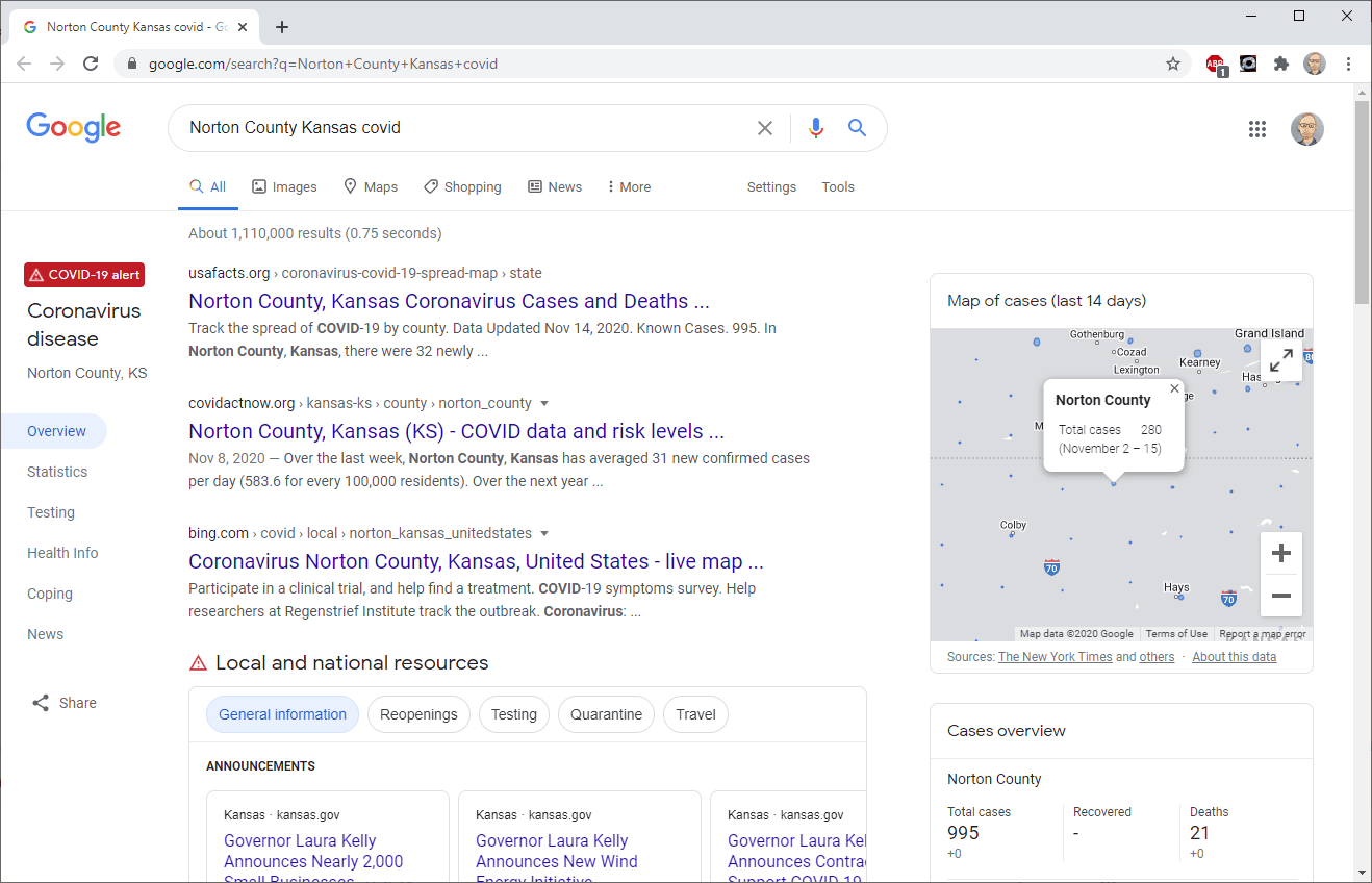 One of the more useful features of the Wildfire application has been the automatic search links provided for fires. We’ve taken that lesson and applied it to CovidPulse. When a state or county is selected, a search button launches a Google search about covid in that area.