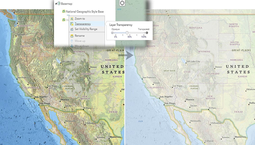 I need to give myself some room to maneuver. The strong background layer incorporating the water and land colors defines the look of the map at small scales, but it is raster-based, and therefore not customizable. What I can do is use a transparency setting to fade it back. I’ve set it to about 45% of the full saturation.