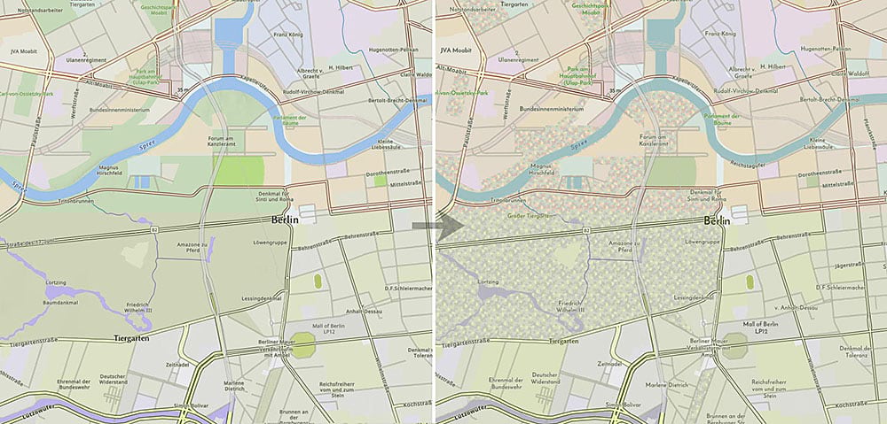 I’ve also introduced a ‘fall trees’ pattern for parks and forests at larger scales (See ‘Icons & Patterns’ for more information on how to do this). I’ve used transparency settings to blend them into the solid color at smaller scales.