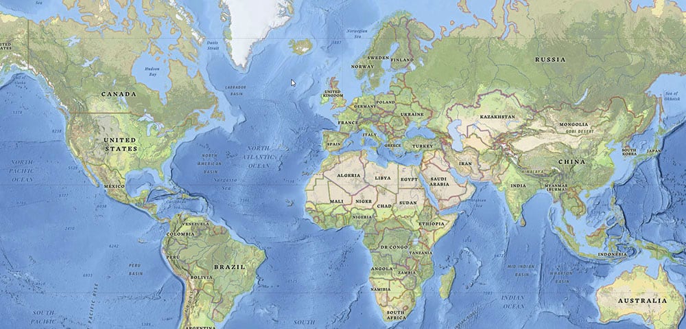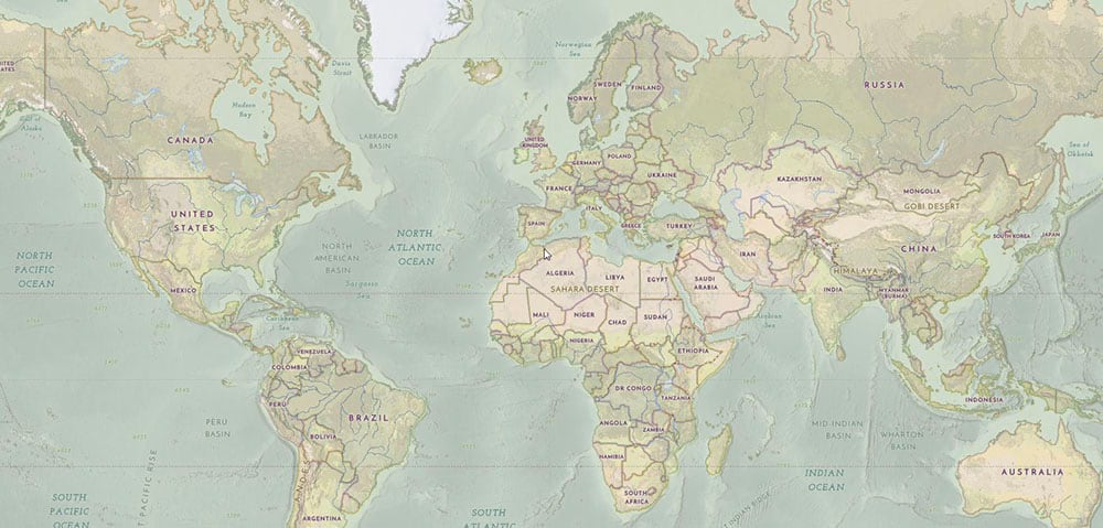 I’m going to work with the National Geographic Style basemap as an example of this Arguably it has the richest palette of our core basemaps, it has a lot of content, and only part of the information can be restyled. So how do you start with a map like this? (If you want to jump ahead to the final result, the new map is here).