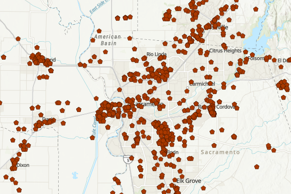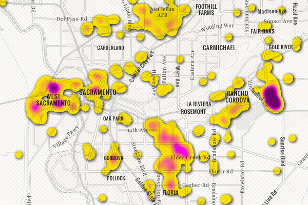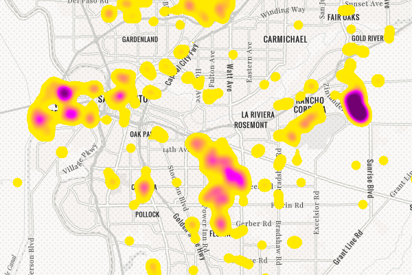 Heat Map symbology helps visualize dense points and reveals patterns of distribution.