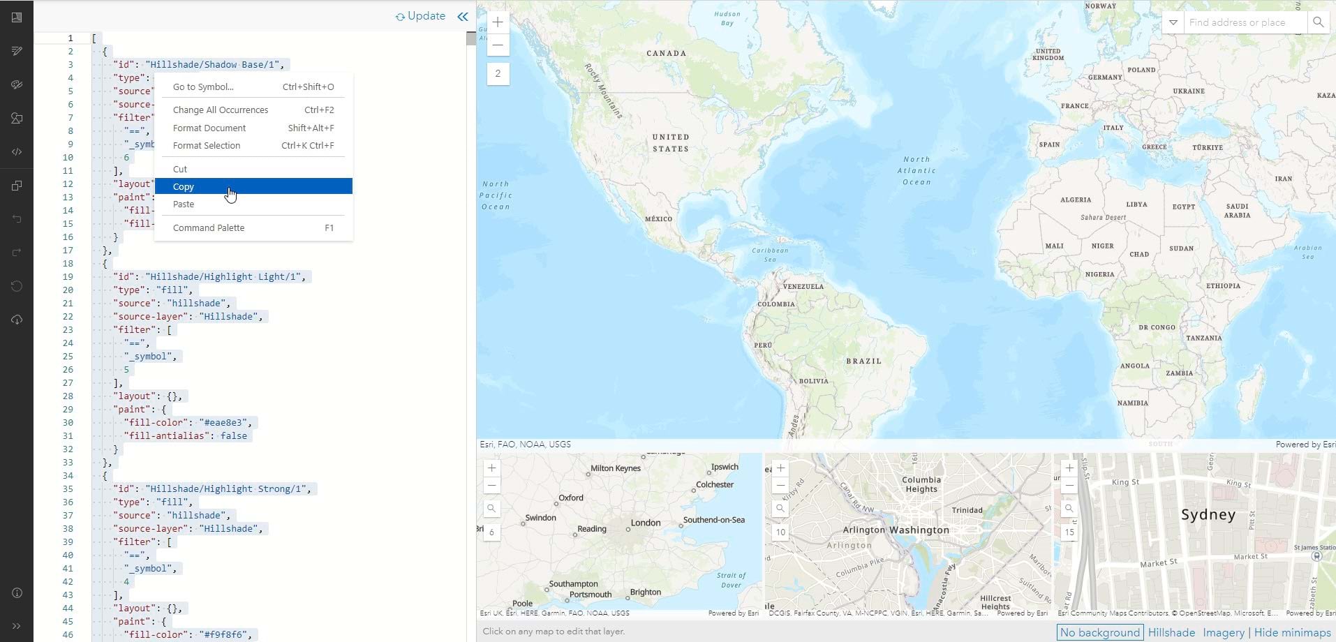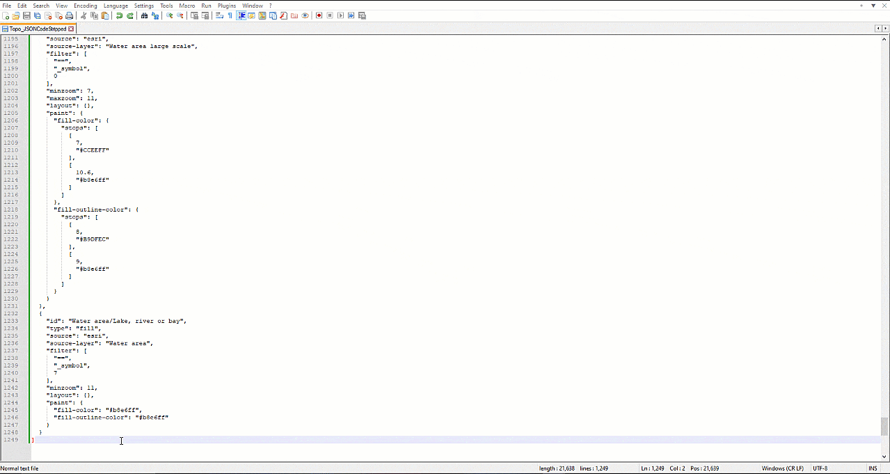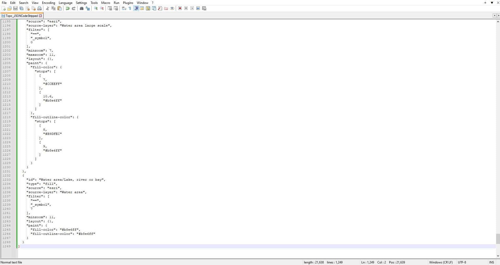 What we are going to do is copy/paste the sections of the code we need and put them into the Notepad++ document. Let’s start at the top by copying all the Hillshade layers plus the beginning JSON formatting. This is line 1-113.