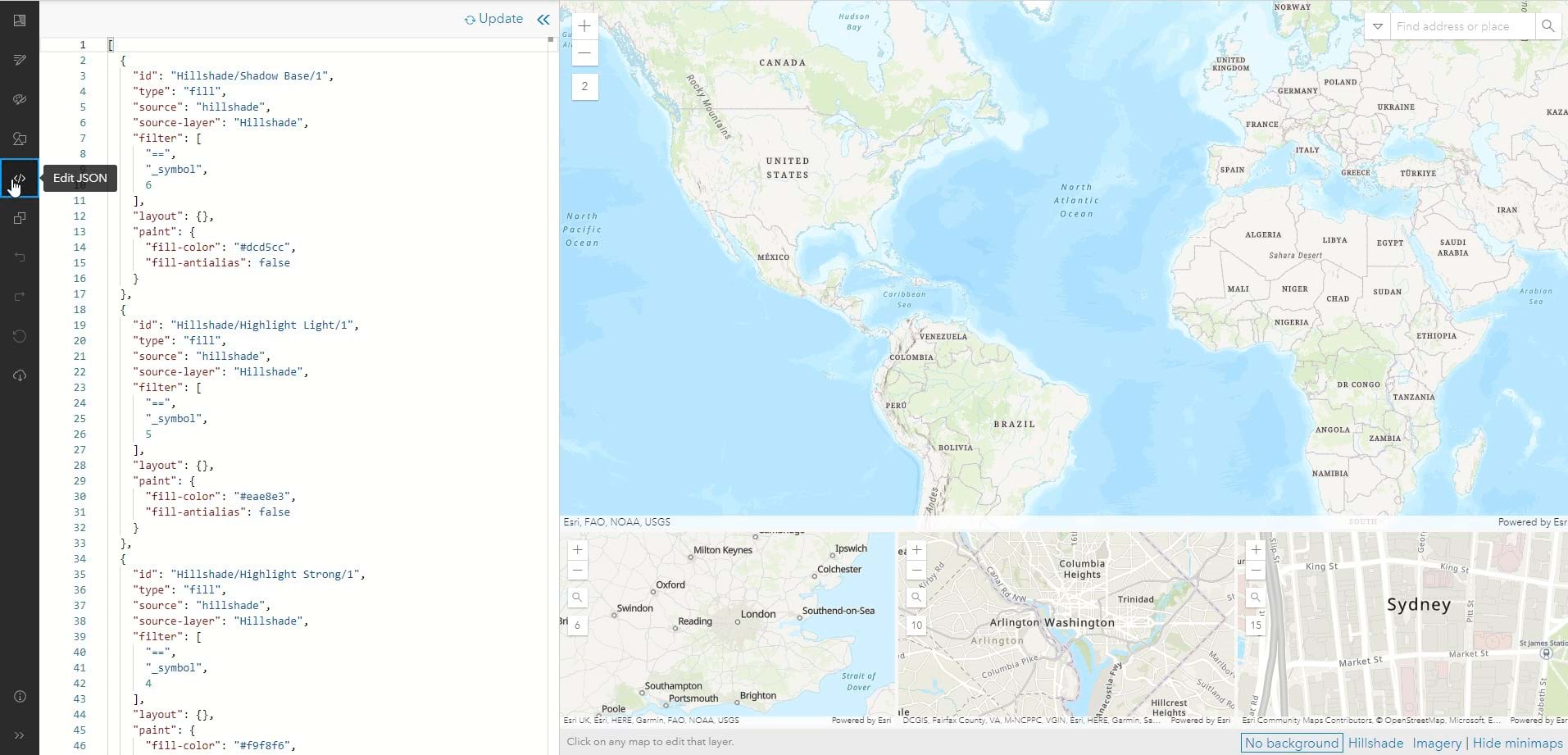 For our purposes we are only interested in a few layers that are found within Natural, Land Use, and Water categories. You could use the Editor to go in and turn off all of the unneeded layers one by one, but it’s faster to remove them directly from the code using the JSON editor.