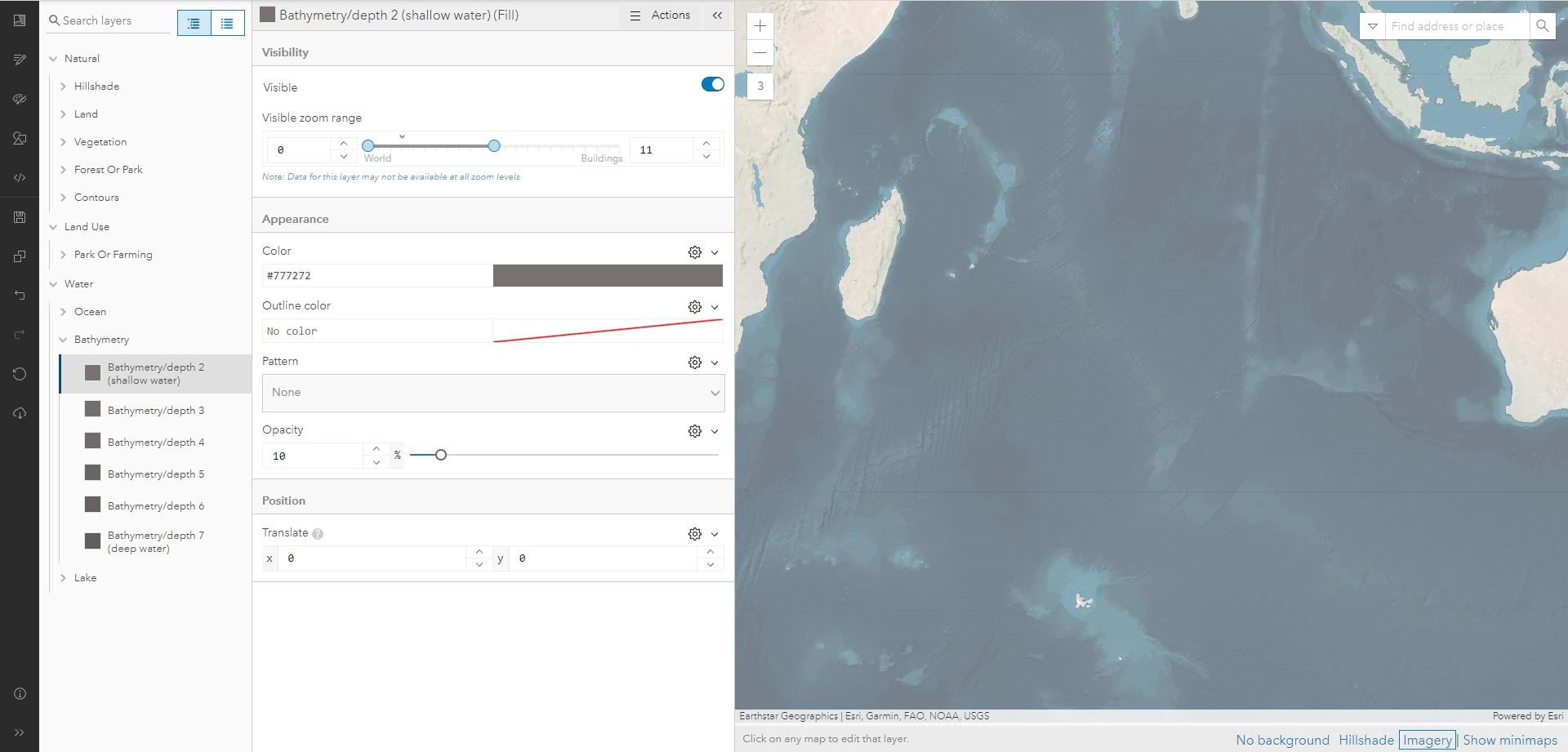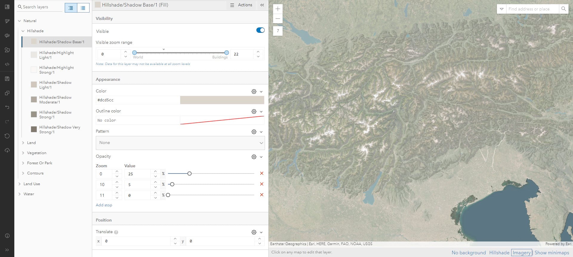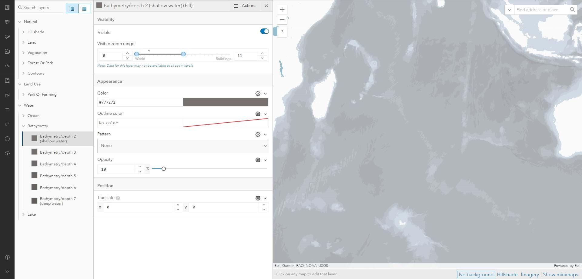Hillshade: This layer is an awesome addition to our options for terrain visualization! As customizable vector tiles! For this map the default colors were kept, but their opacity was adjusted for every layer, so that it goes from 25% opacity at “0 Zoom” to 0% 0pacity at “11 Zoom”. This layer certainly adds texture to the map and embellishes the mountain areas; however, when you zoom all the way in at Scale 11 and just want to see the pure Imagery it disappears. Take note that the Hillshade layer also covers the Ocean and Bathymetry layers and there is more on that later.