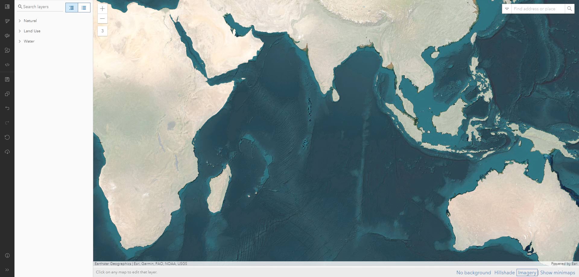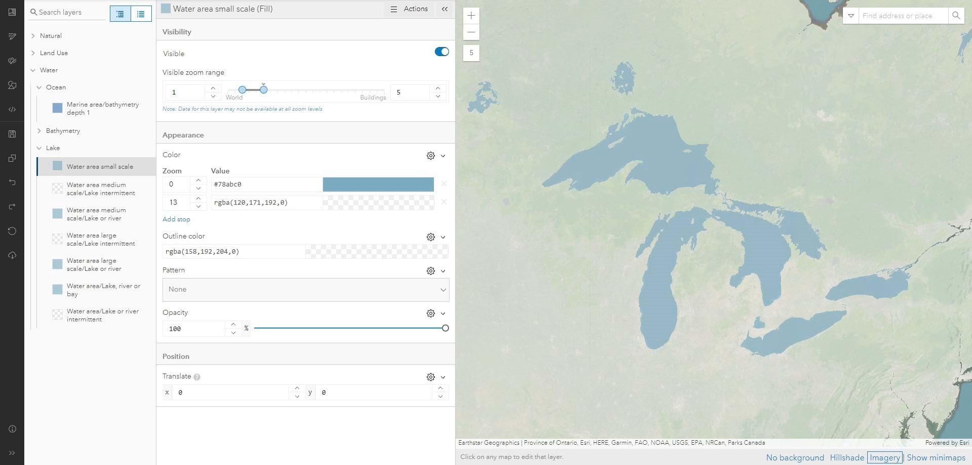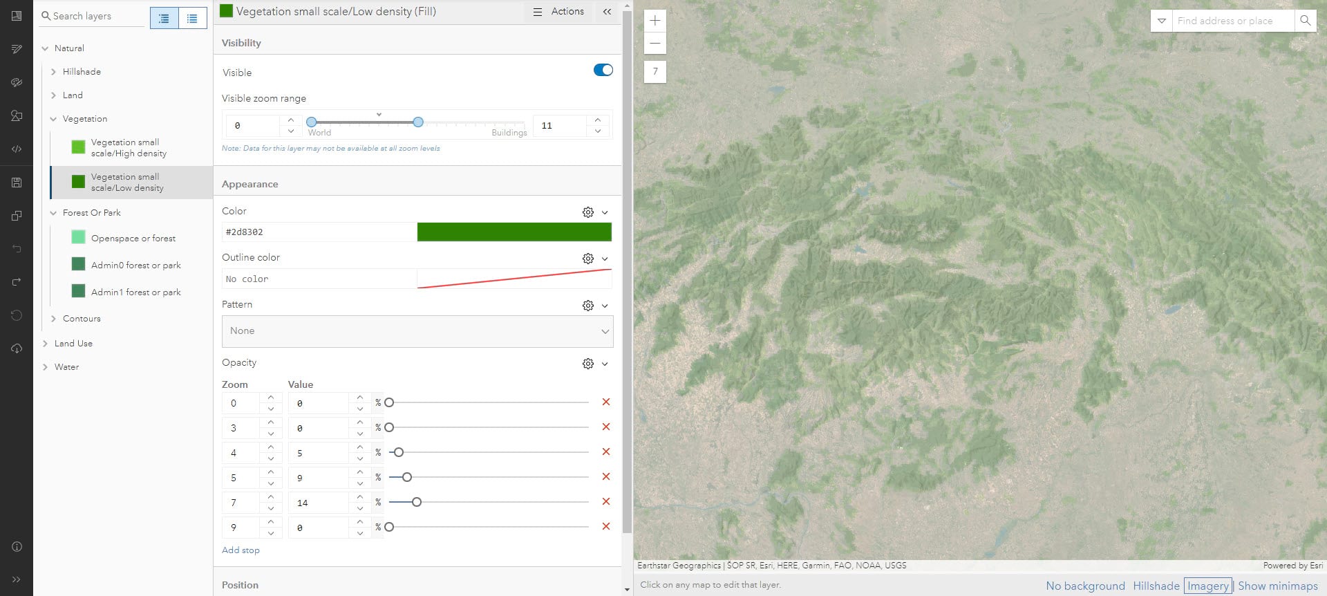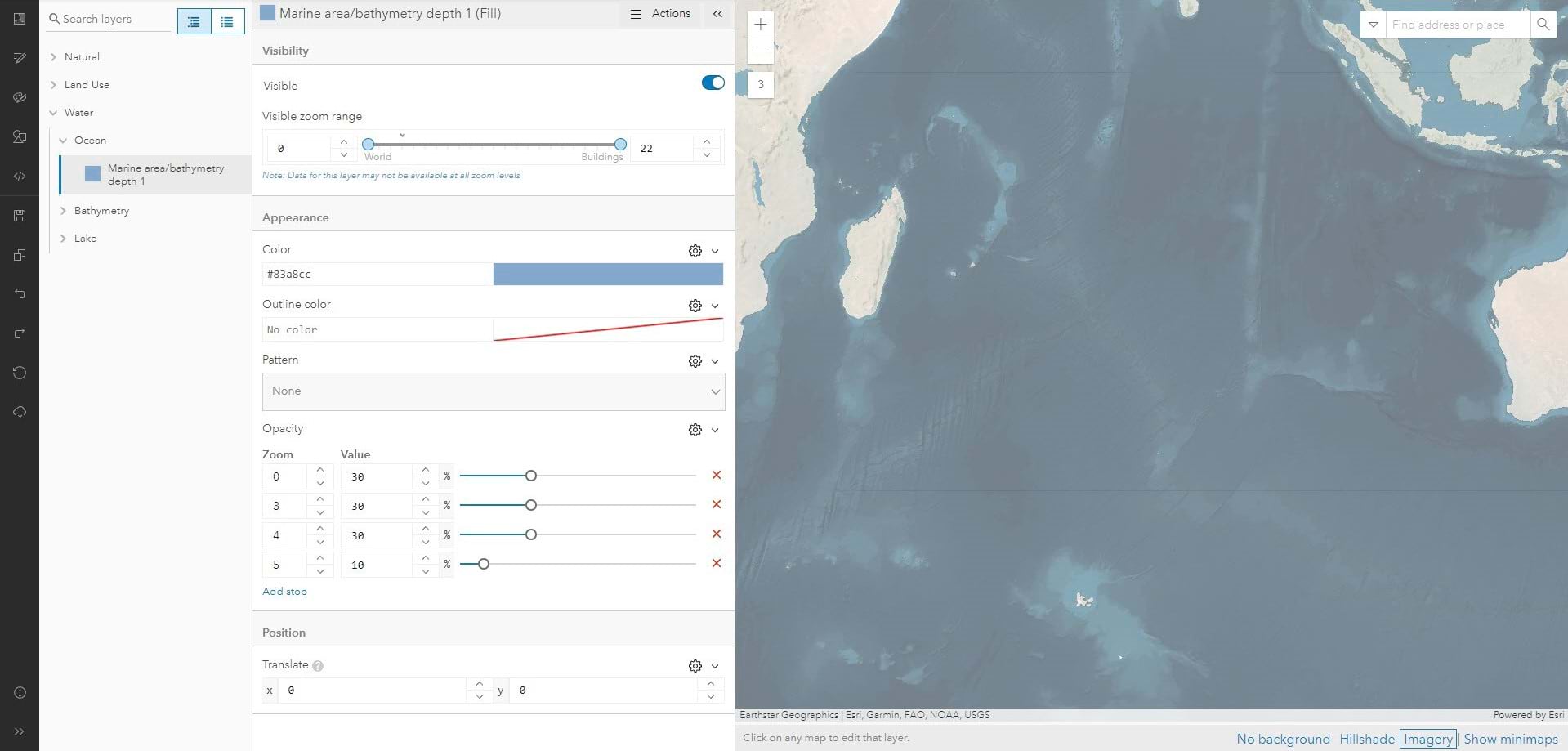 Hillshade: This layer is an awesome addition to our options for terrain visualization! As customizable vector tiles! For this map the default colors were kept, but their opacity was adjusted for every layer, so that it goes from 25% opacity at “0 Zoom” to 0% 0pacity at “11 Zoom”. This layer certainly adds texture to the map and embellishes the mountain areas; however, when you zoom all the way in at Scale 11 and just want to see the pure Imagery it disappears. Take note that the Hillshade layer also covers the Ocean and Bathymetry layers and there is more on that later.