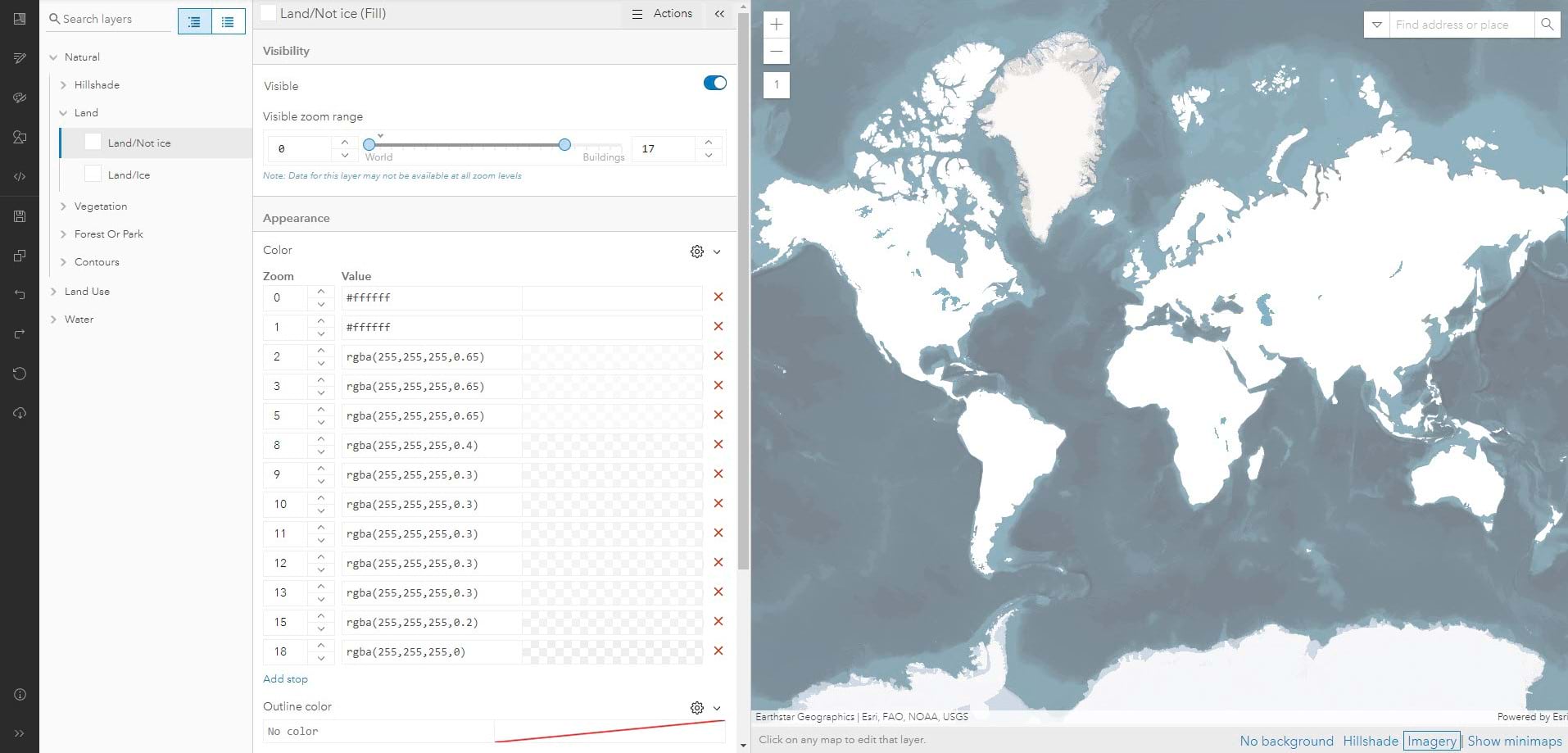 Land: The Land/Not Ice layer has highly customized opacity. It starts off at the global scale as a sold white. Then as you zoom (and you want to see more of the imagery) the opacity lowers until at Scale 18 it is at 0%. Using the land layer to soften the imagery is a good way to get the best of both worlds.