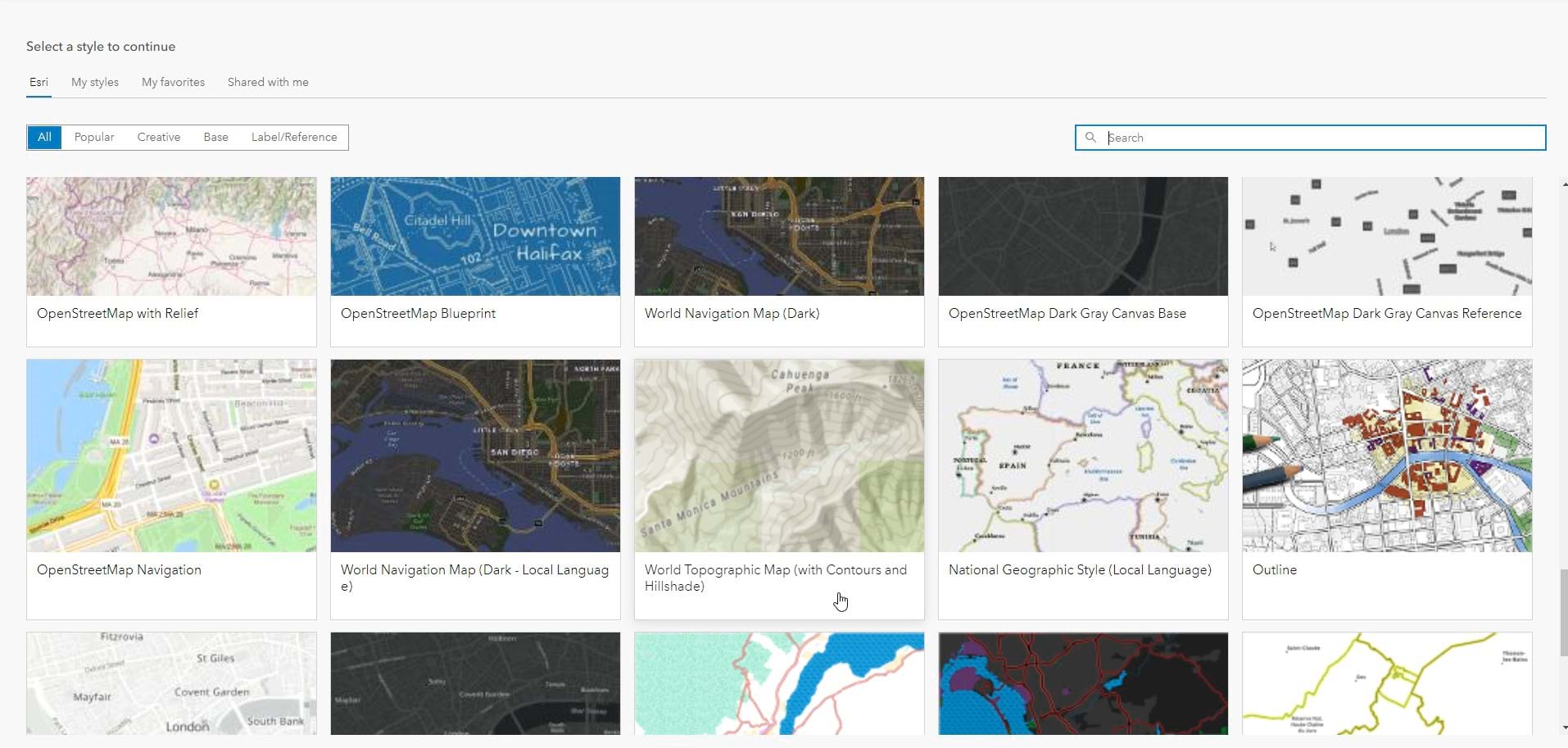 Start by signing in with the Vector Tile Style Editor. Click on the top right green button for “+ New Style” and scroll almost to the bottom and select the World Topographic Map (with Contours and Hillshade).