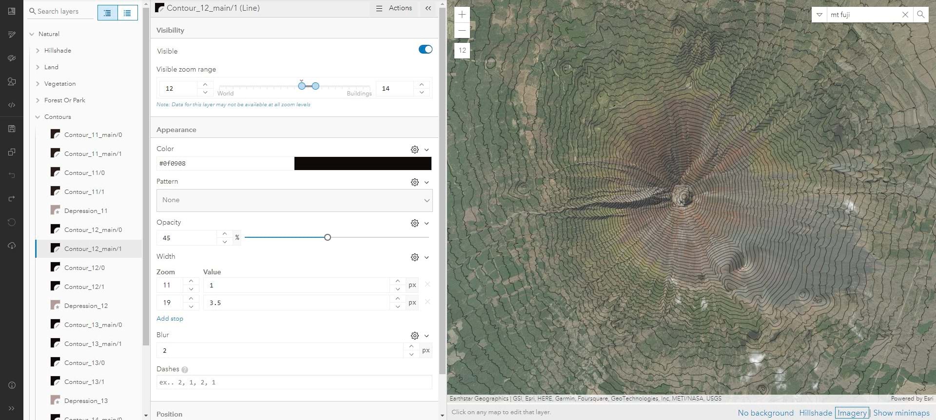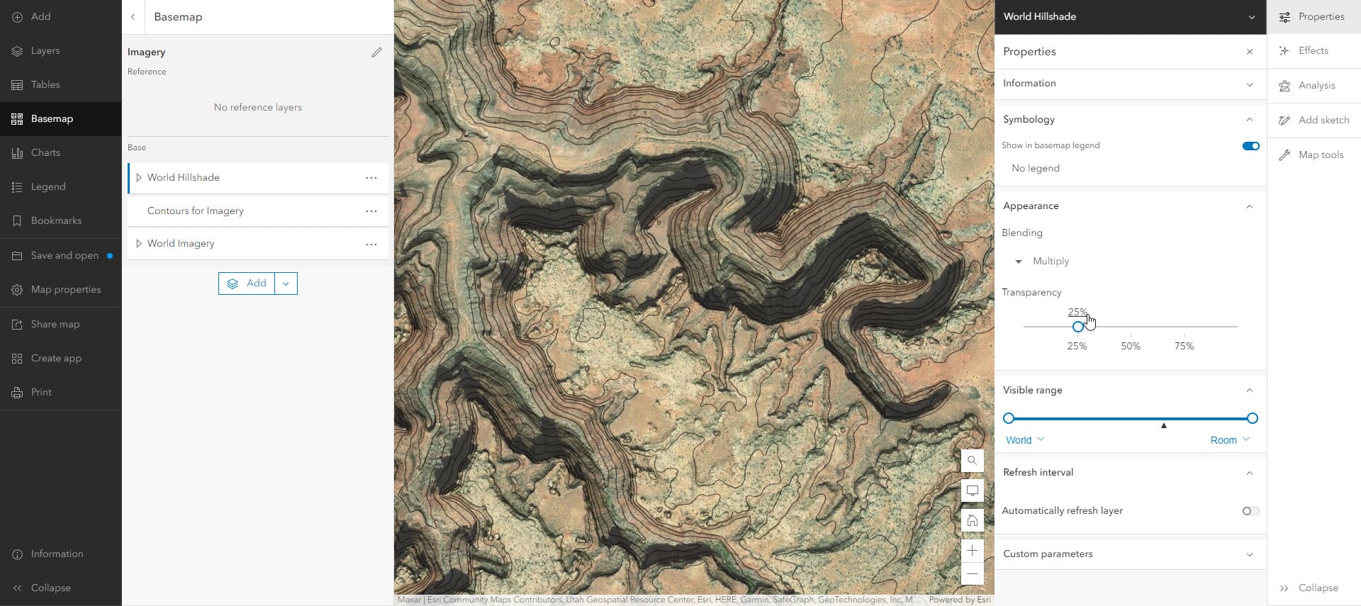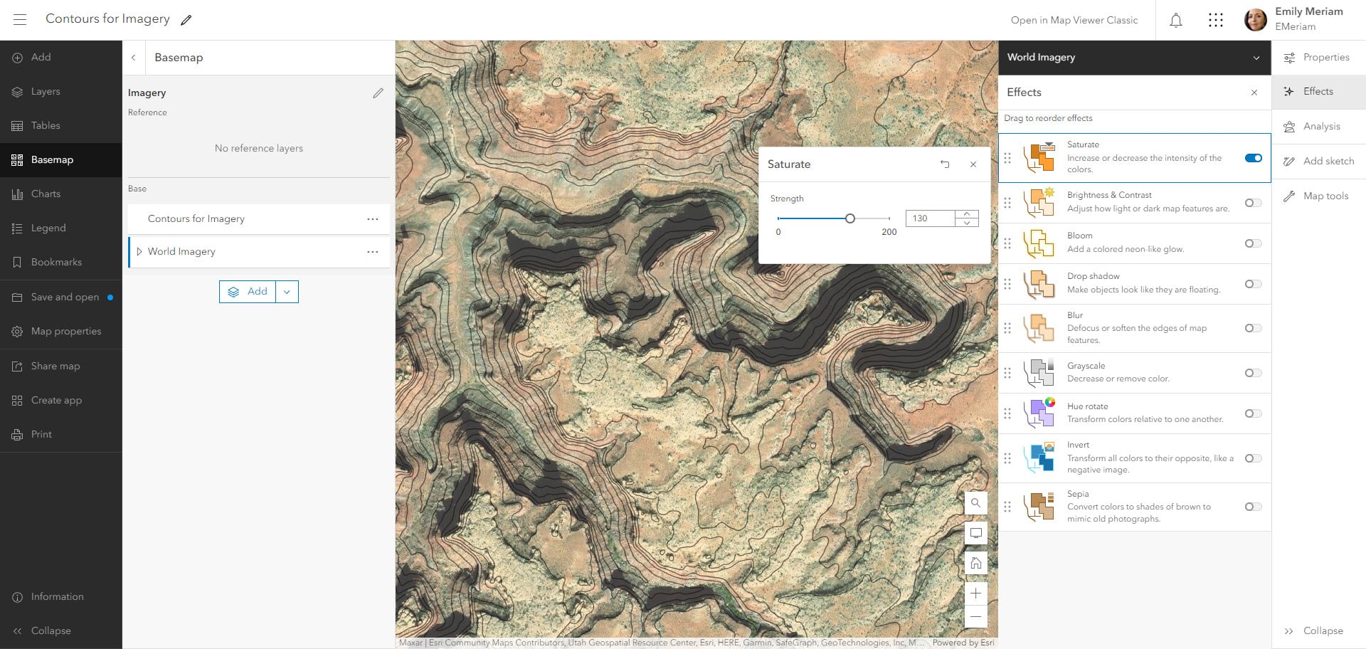 The final step is to open up an ArcGIS Online webmap. Replace the default basemap with this customized Vector Tile Layer along with World Imagery. Let’s bump up the Imagery layer with the Saturate Effect by setting that to 130. This gives it a bit more richness and helps to play off the contours.