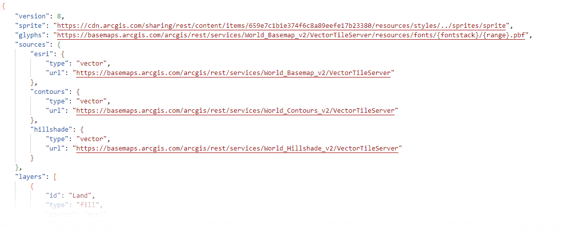 - Carefully remove all of the code that does not relate to the Hillshade and Contours (assuming you want both services). A search for “source”: “esri” will help you to identify it. Leave the square brackets at either end of the code.
