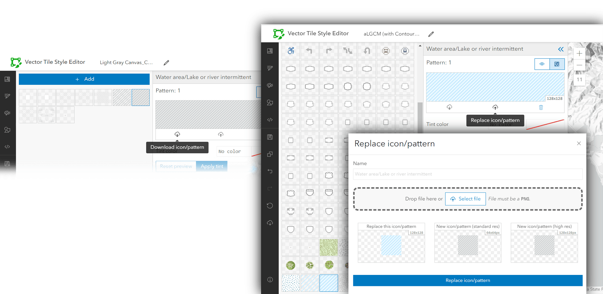 In your source basemap, go to the ‘Edit Icons and Patterns’ menu in the sidebar and select ‘download’ for your chosen symbol. Find the equivalent symbol in your new map and replace it with the download.