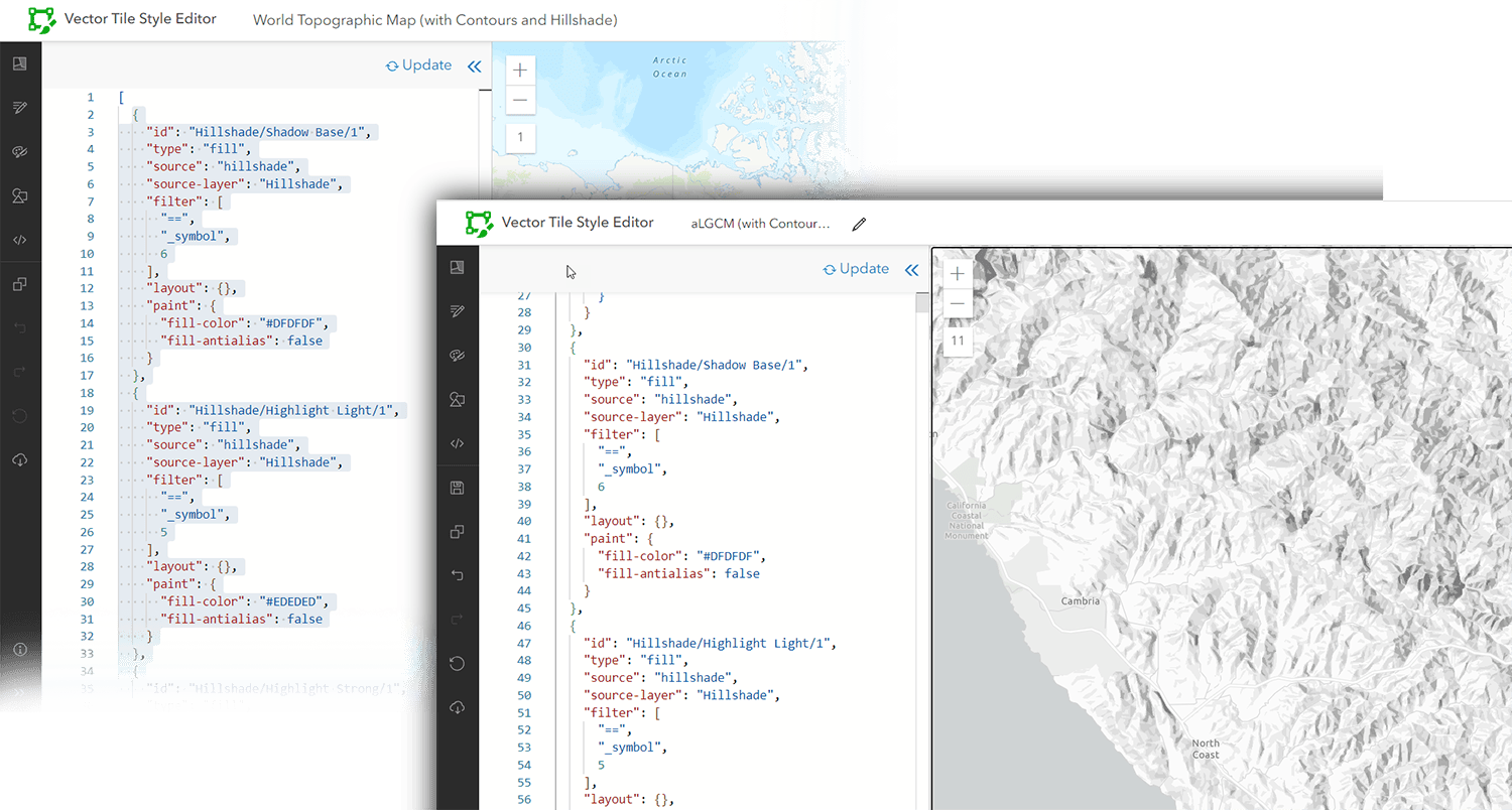 Esri now has vector tiles for World Hillshade, and for World Contours. These can be accessed directly through the Living Atlas and added to your map as separate layers in Map Viewer or ArcGIS Pro. Blends and effects then provide you with a slew of different ways to incorporate them into your design.