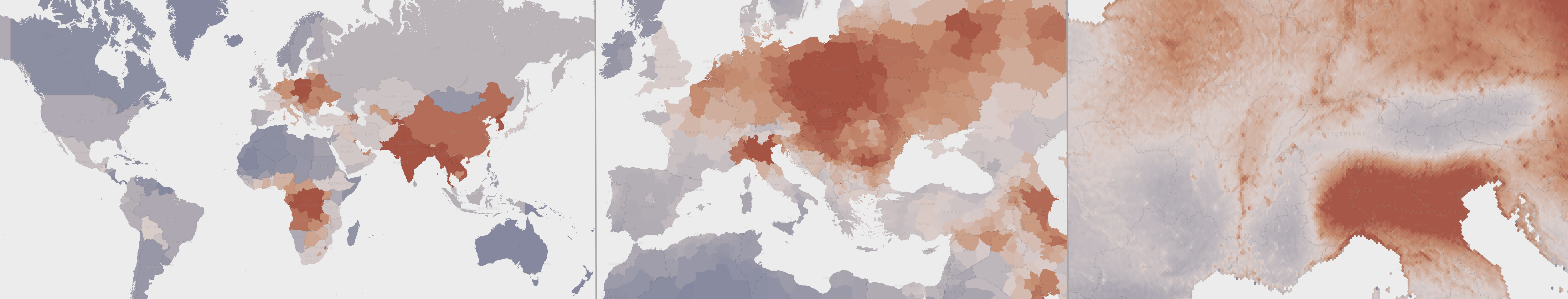 In order to enact change where air quality is disproportionately impacting the population, governments or policymakers may want to explore each of the questions listed above. For example, the United Nations Sustainable Development Goal 11.6.2 sets a target to reduce the per capita impact of fine particulate matter. To do this, not only the raw PM 2.5 figures are needed, but also the population weighted figures. The animation below compares the aggregated PM 2.5 figures (left) to the population weighted PM 2.5 figures (right). Notice how many countries that meet the WHO guideline no longer show as grey, because there are a large amount of people feeling the impact of poor air quality.