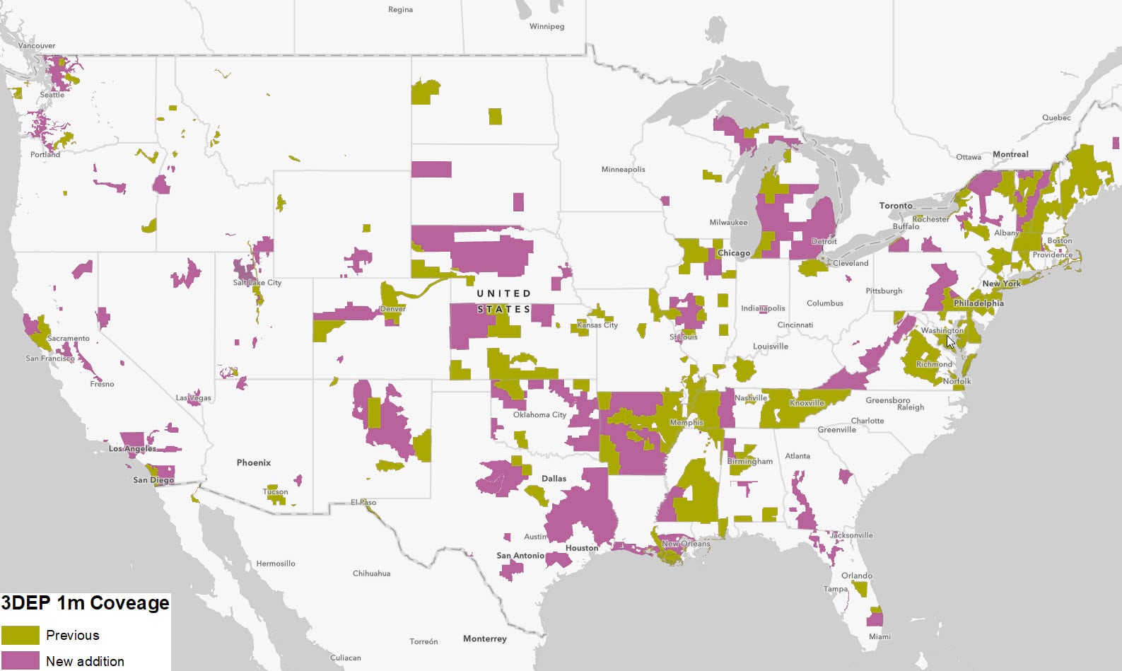 In this release, USGS 3DEP 1 meter got a significant update, increasing the 1m coverage area to almost double. The graphic below shows the coverage of newly added (magenta) 3DEP 1m data along with previously available (yellowish green) coverage.