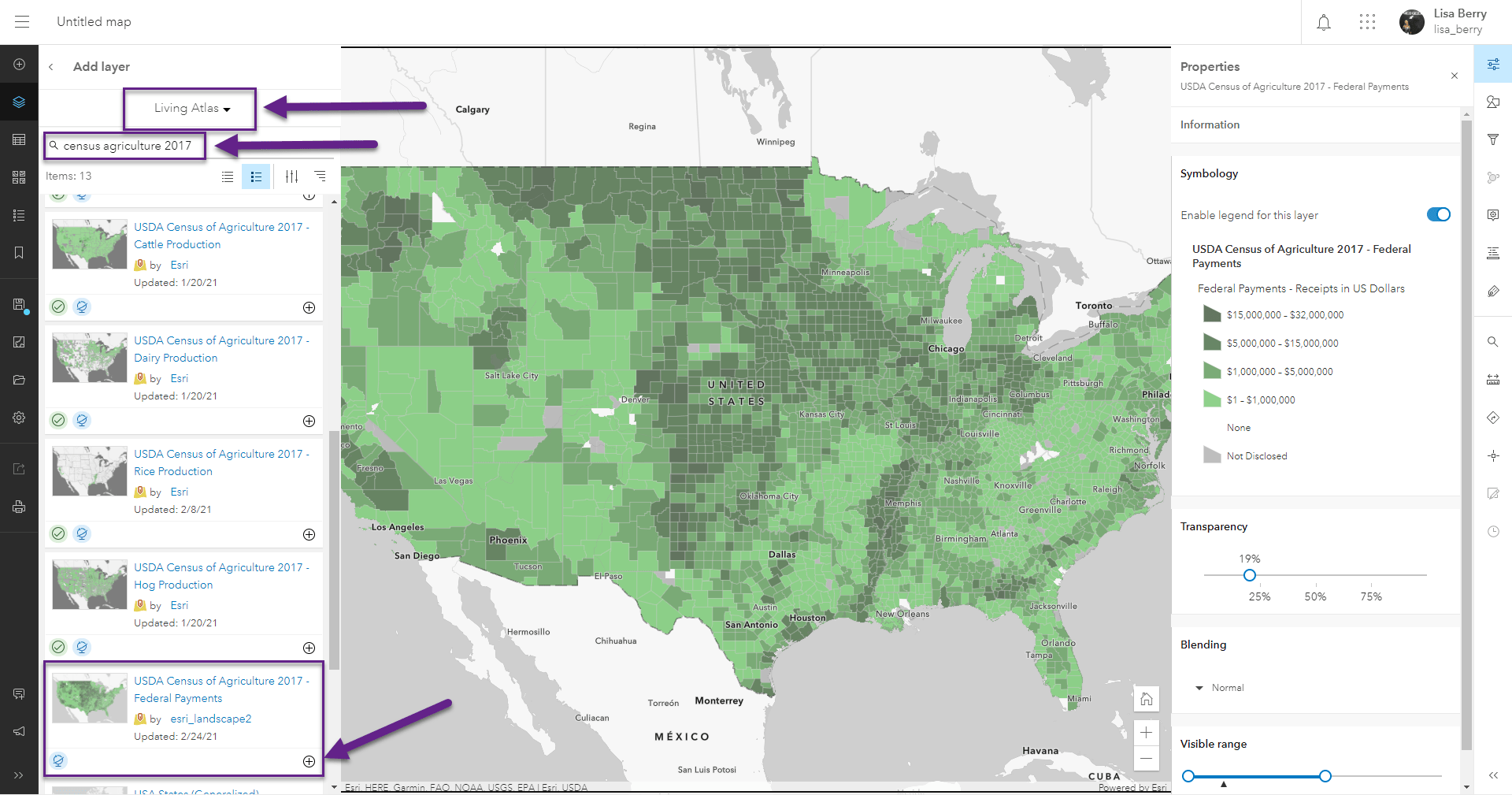 To add the layer to your map, search Living Atlas for “census agriculture 2017”. You’ll find all of the various USDA Census of Agriculture layers in Living Atlas, including the Federal Payments layer.