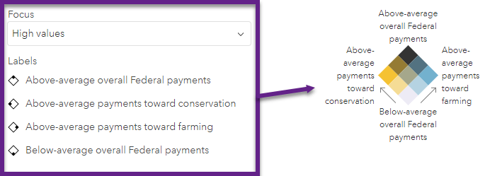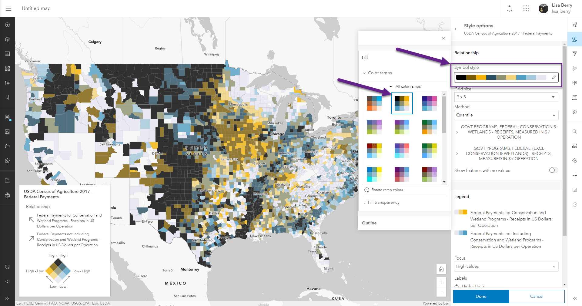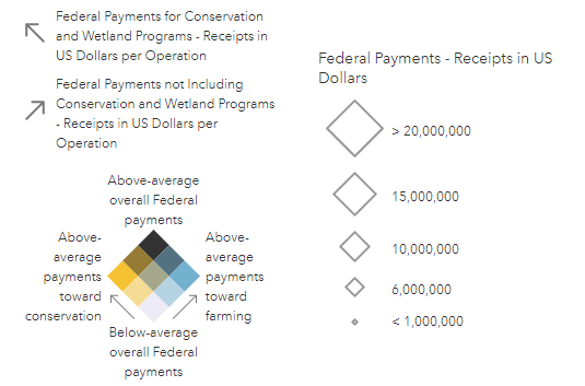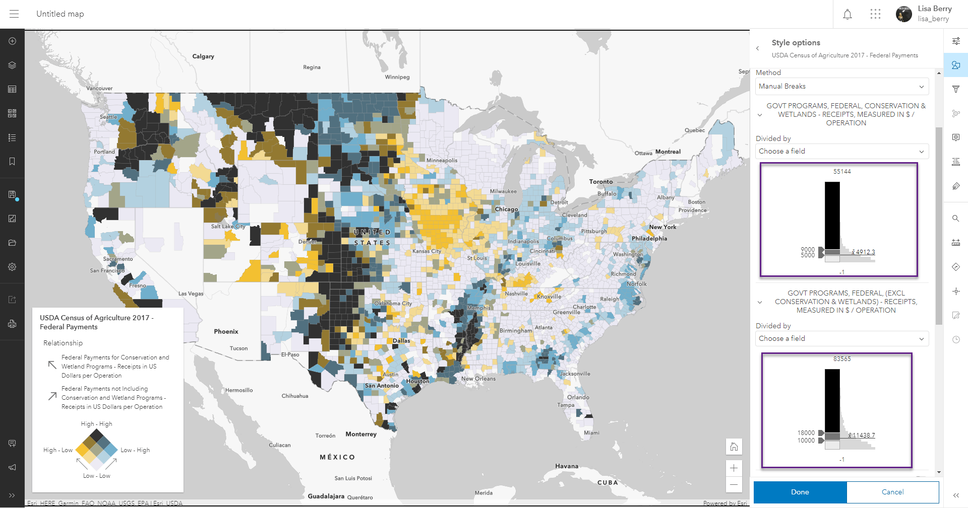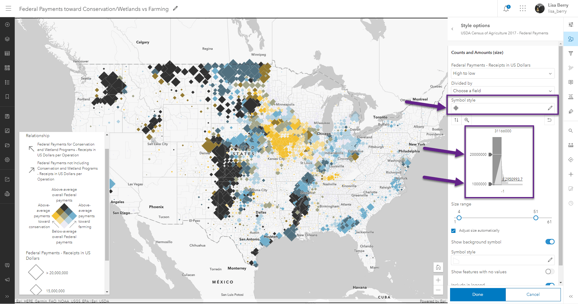 In the blog Our Four Favorite Ways to Map American Agriculture, four teammates from the ArcGIS Living Atlas team share four different approaches for mapping agricultural topics. This blog provides a tutorial for how to create the map Federal Payments toward Conservation/Wetlands vs Farming, which utilizes a relationship mapping style in ArcGIS Online. The data within this map is created by the United States Department of Agriculture (USDA), and comes from their 2017 Census of Agriculture.