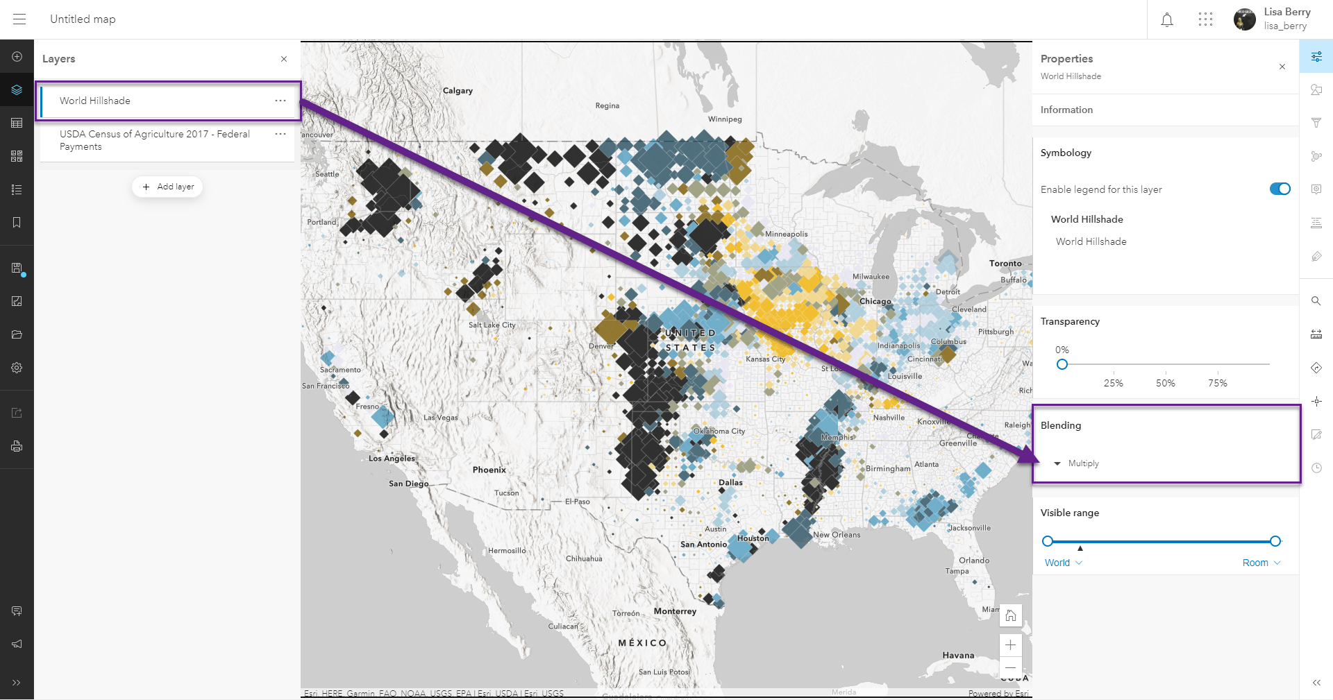 To accomplish this look, add the World Hillshade layer by searching “world hillshade” within Living Atlas like you did in Step 1. Once the layer is in the map, select it on the left toolbar to see the layer Properties on the right toolbar. Within these properties, change the Blending setting to Multiply. This will allow the mountains and the data pattern to appear without fading the colors like you normally would see with transparency. Check out this blog for more information about using Blending modes with thematic data.