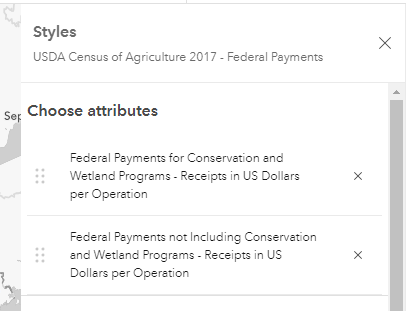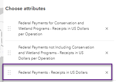 Click Done to save your settings so that you are back to where you choose your attributes. For this map, I am going to add a third attribute, Federal Payments – Receipts in US Dollars, so that we can emphasize total Federal spending.