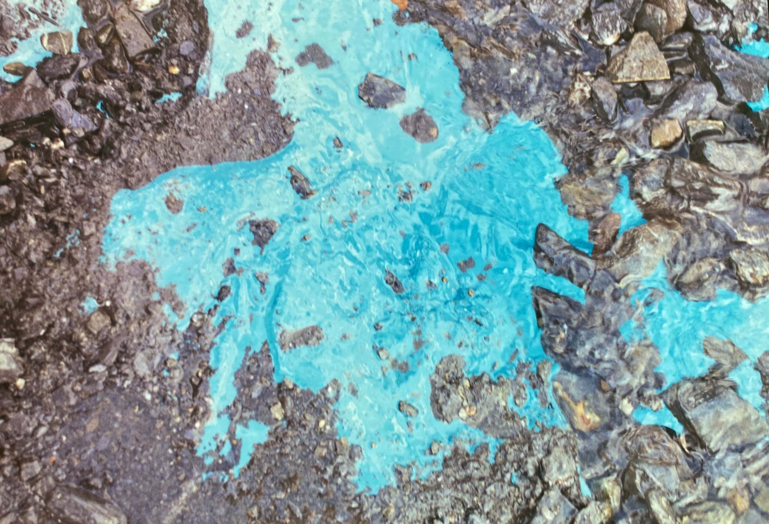 On that same trip to Alaska in the year 2000, I was walking along a gravel wash near the edge of nearby Matanuska Glacier. The surface was a mix of snow, tumbled stone, and some soil. The occasional small coniferous tree grew here and there. Then I noticed a brilliant blue stone that…impossibly…glowed. It was surreal. I kicked away some of the gravel around it to see what sort of sorcery this was and I realized that I wasn’t walking on the gravel near Matanuska Glacier, I was walking on Matanuska Glacier. A small bit of the hundreds-of-years-old compacted ice was exposed to the surface, peaking out from the detritus it had picked up on its journey down the valley. The aqua chatoyancy of the ice mass shone up through that exposed bit of ice like a buried floodlight. I nearly lost my footing in grasping the mass and pervasive presence of the glacier and my unexpected position on it.