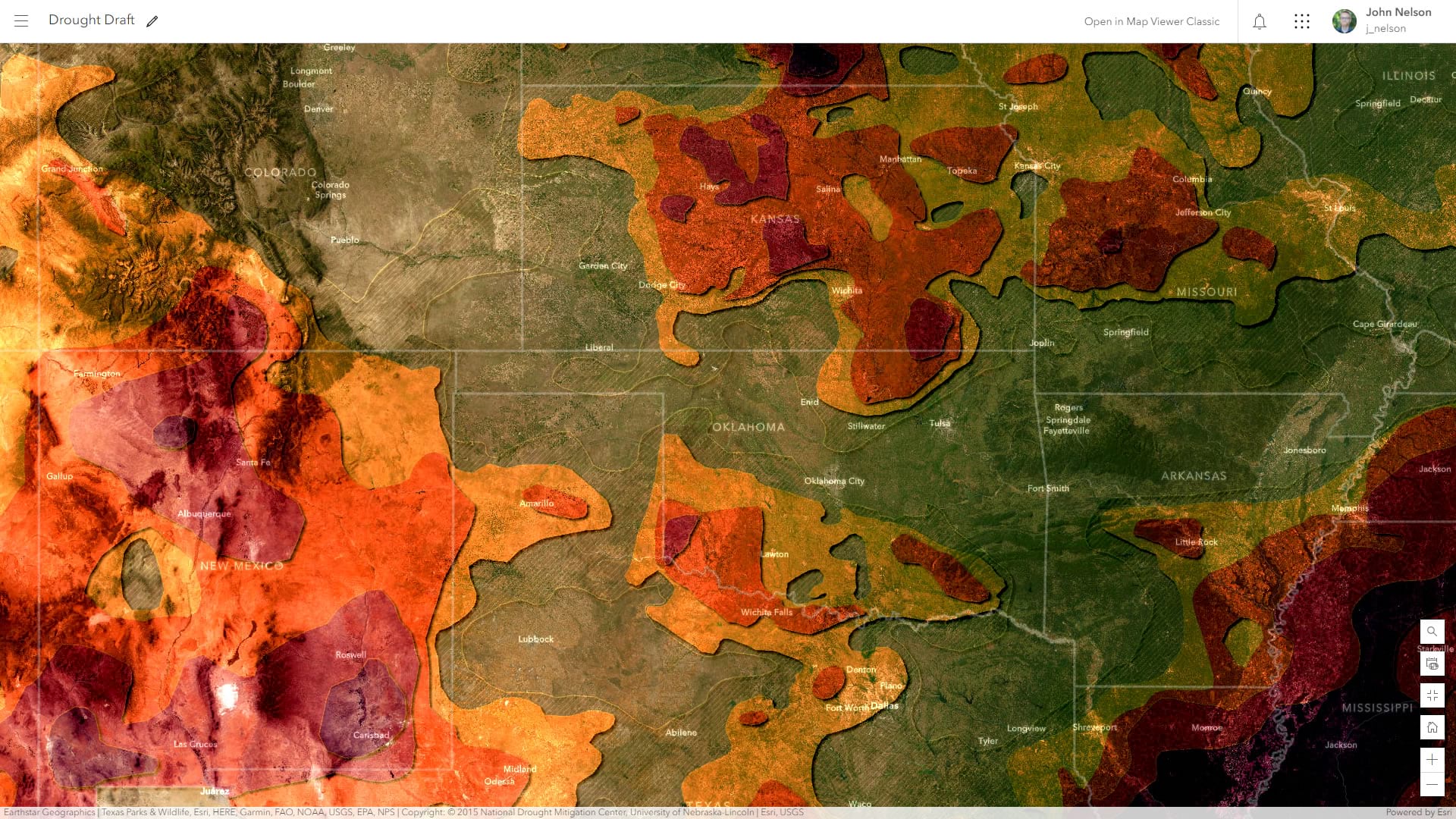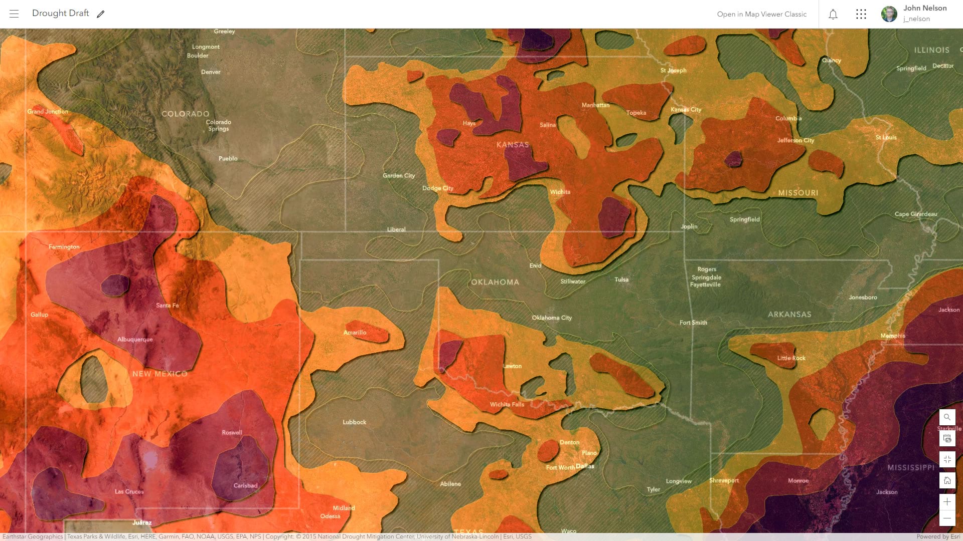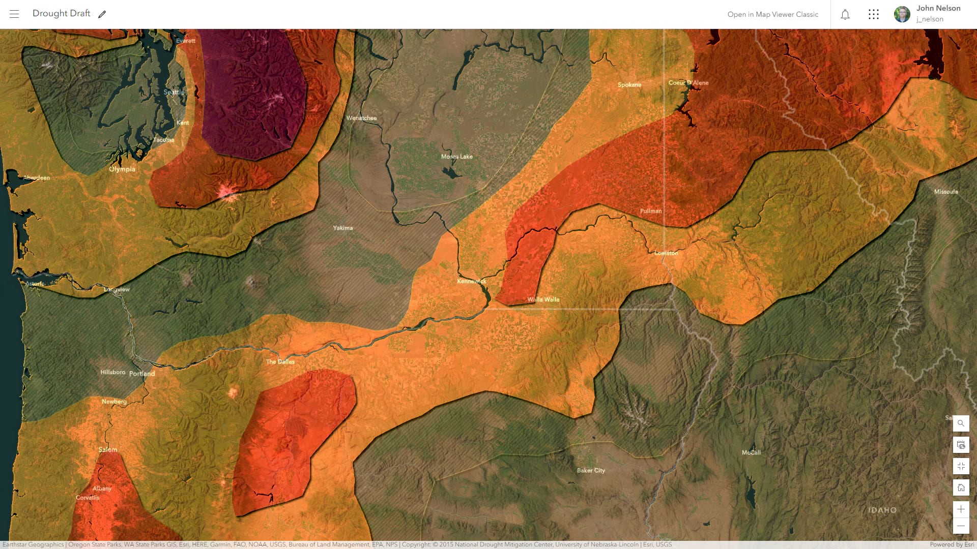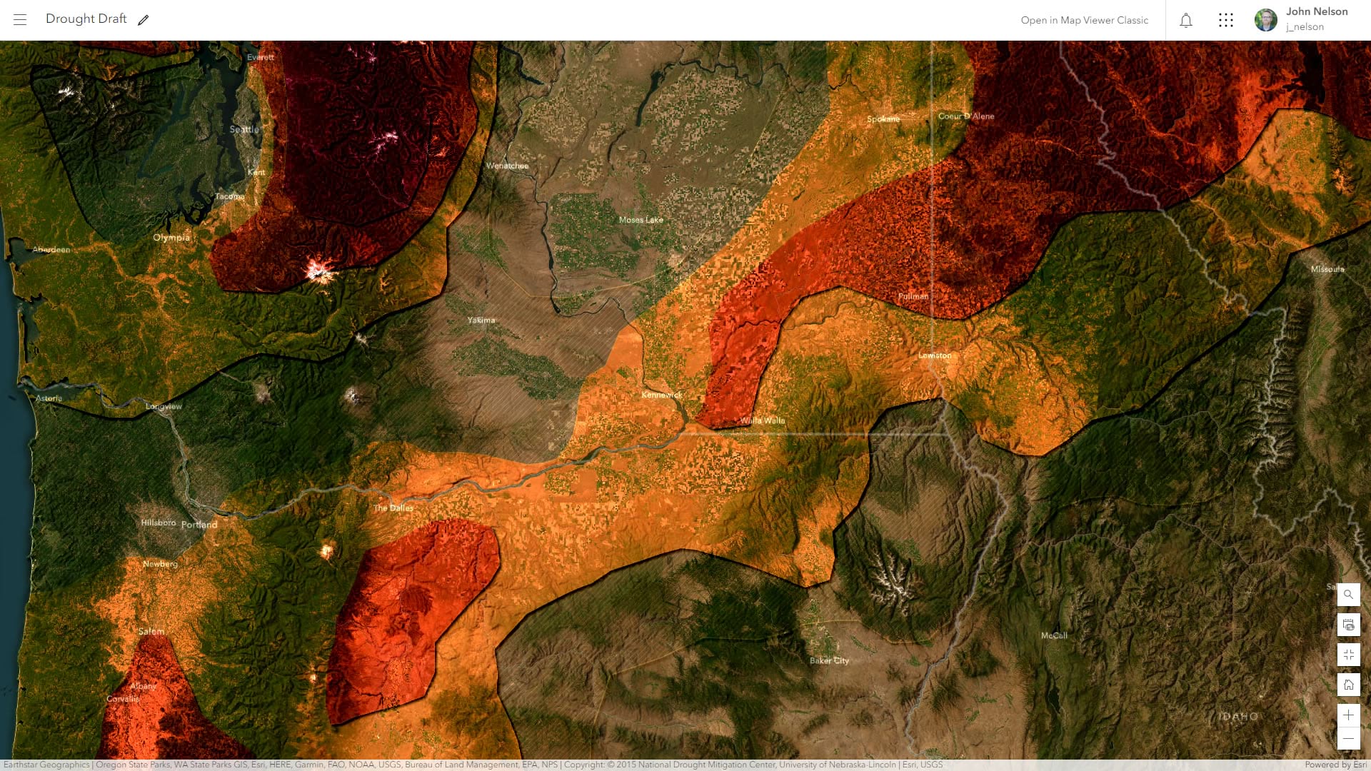 Should we toss imagery out entirely? Not necessarily. If we reduce the tonal variation of the underlying imagery basemap, we retain the benefits of seeing our mapped phenomenon in the context of its natural landscape and we minimize the visual interference that comes along with it. Here is an example of the newly toned down imagery basemap, over which the drought categories are much more visually discernable.