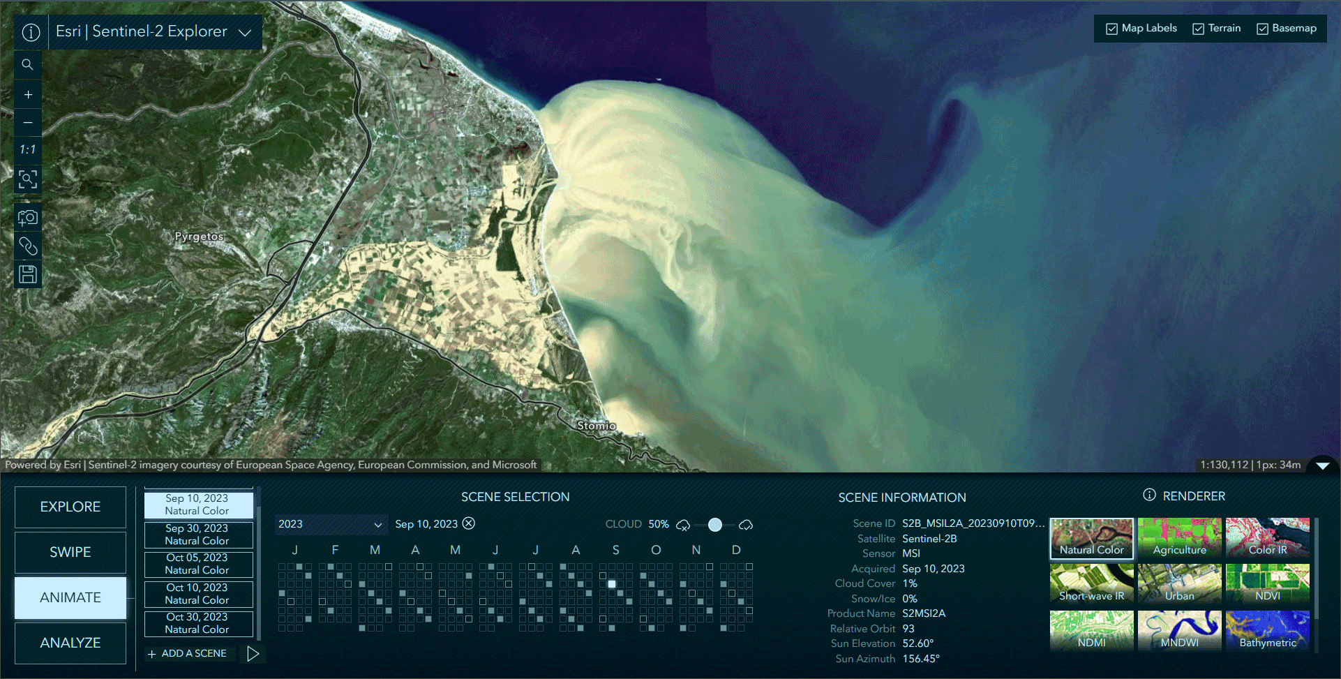 Step 1 – Click the button below to open Sentinel-2 Explorer in dynamic mode with the Natural Color renderer to the area encompassing the Pineios Delta.