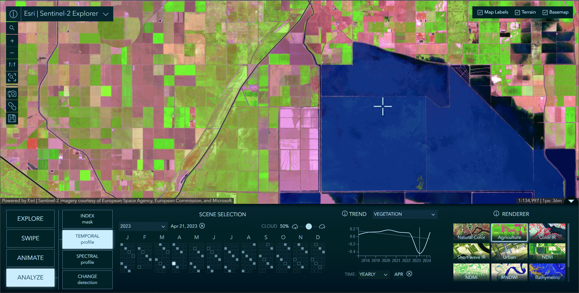 Step 1 – Click the button below to open Sentinel-2 Explorer in Dynamic view mode to the Tulare Lake Basin area using the Agriculture renderer.