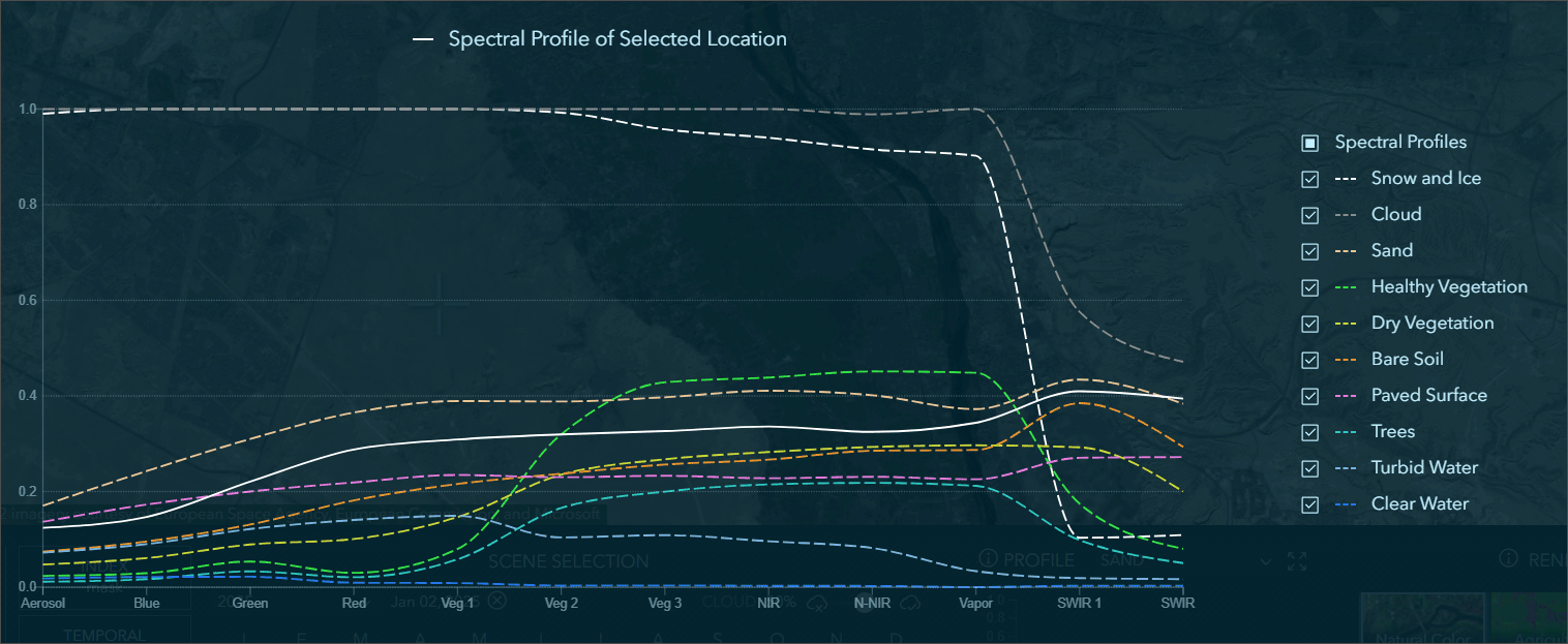 Use any scene and renderer. Using the Spectral profile tool, you can click anywhere on the map and a spectral profile for that point will be generated. The profile will be matched with one of the pre-defined spectral signatures available in the Profile drop-down list. The match accuracy may vary, depending on multiple factors such as sampling methodology and inherent limitations in the data.