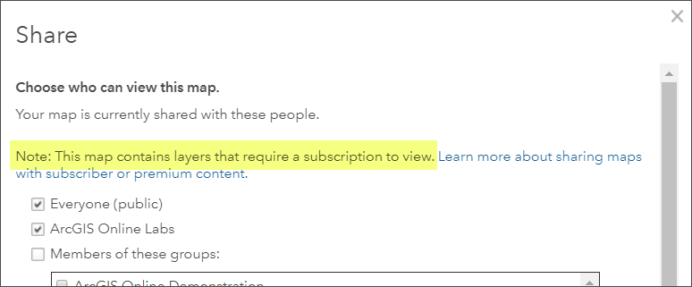 When you share a web map or scene using subscriber content, you’ll be notified that the map contains subscription content and others may not be able to view the map.