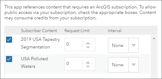 Older configurable apps, such as Basic Viewer and others found on the Configurable Apps Gallery, will not automatically authorize public use for non-premium subscriber content. Both subscriber and premium subscriber content will be identified; check the box to enable public use in the app.