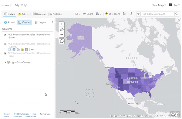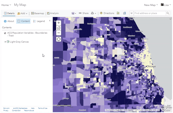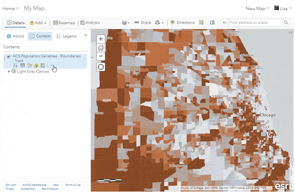 For example, the GIF below shows how the ACS Population Variables – Boundaries layer can be easily filtered to show only the state of Illinois in order to make a map more specific to Chicago, IL.