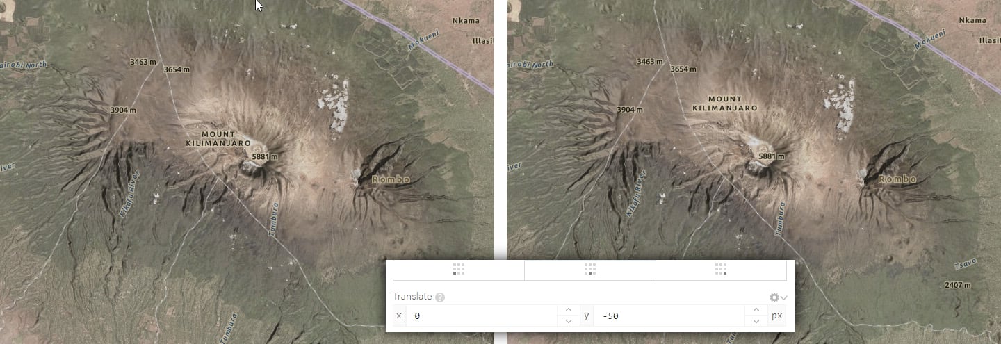 If you want a quick fix, and you don’t care about what happens in the rest of the basemap, use the offset tools in the VTSE to move it to a better spot. This is my imagery/hillshade composite zoomed-in on Mount Kilimanjaro. The label is not really necessary in this context, and it is right over the summit. Using the ‘Translate’ option in the Style Editor, I’ve moved it out of the way: