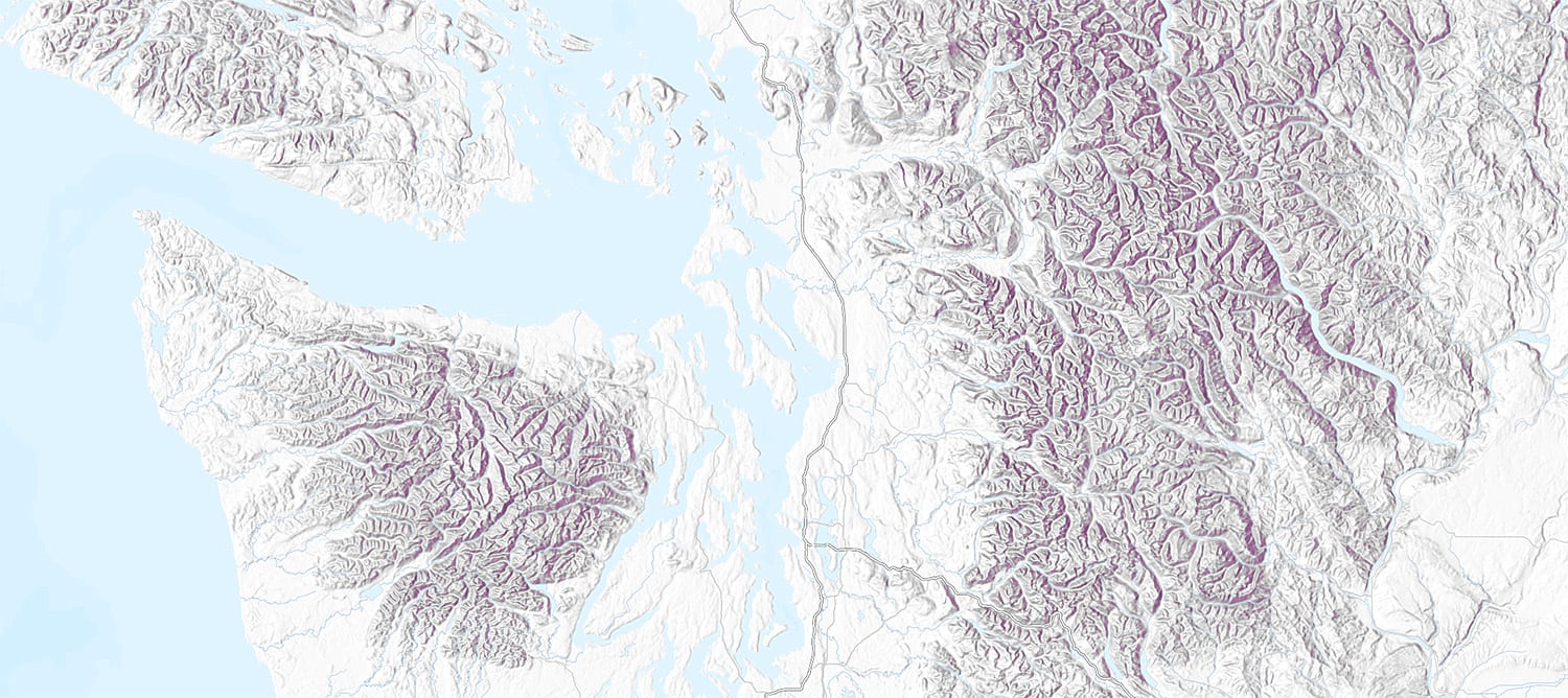 Other interesting looks can be achieved by blending multiple levels of hillshade to get colored or duotone-like effects. Here two hillshade layers are combined, with brightness and contrast Effects used to isolate the steeper slopes:
