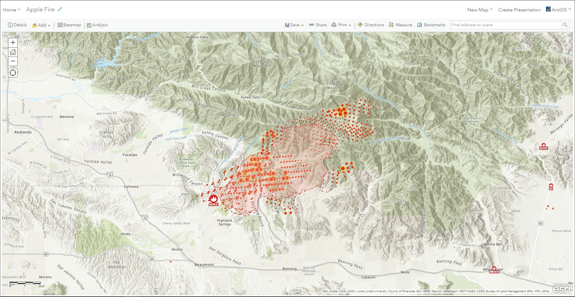 In just a few clicks a map of the Apple Fire has been authored, showing the current fire perimeter along with VIIRS satellite hot spots.