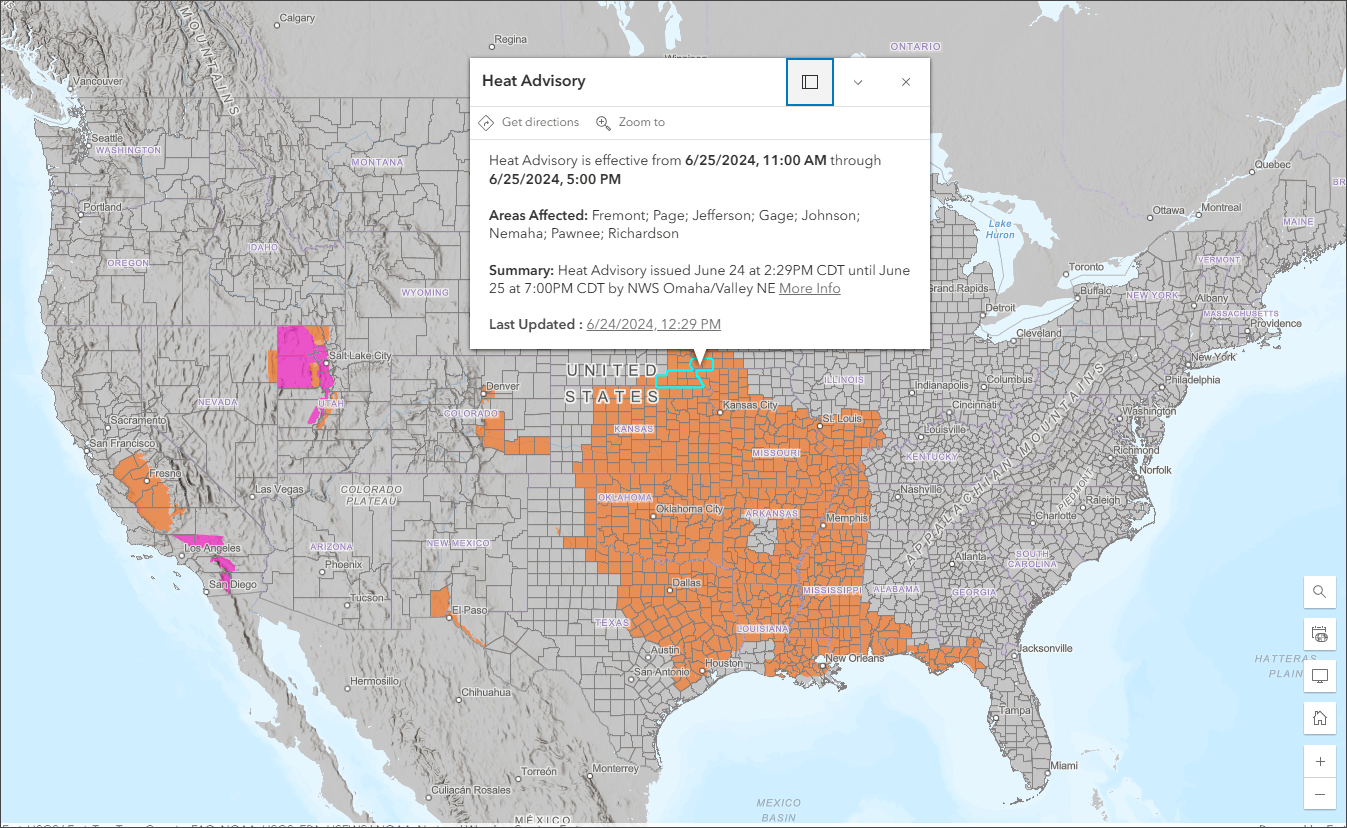 In the news: It’s been very hot… Over the last few days at Esri’s corporate headquarters in Redlands, California, temperatures passed into the low-100s. Last week, a heat wave scorched parts of the U.S., pushing the heat index into the 90s and well over the 100s in some areas. This week, the heat has shifted once again to the central U.S., driving temps up in Oklahoma, Arkansas and Missouri. As of Monday morning, National Weather Service meteorologists have issued either heat advisories or excessive heat warnings for 23 states, with heat impacts expected to worsen before relief can be found.