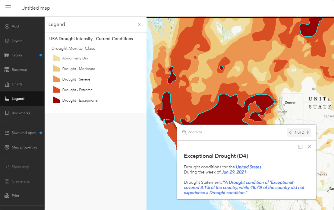 ArcGIS Living Atlas of the World includes authoritative live feeds and other content that helps you learn more about current conditions and events. Follow these steps to make your own map of current drought conditions in a minute (or less), using Living Atlas content.