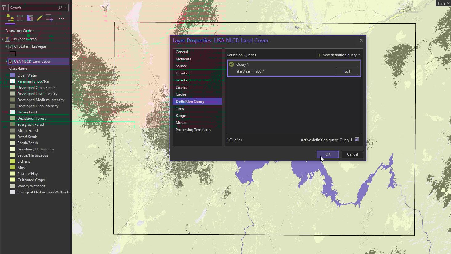 Right click on your NLCD layer and open Properties and select Definition Query. Write an expression where: StartYear = ‘2001’