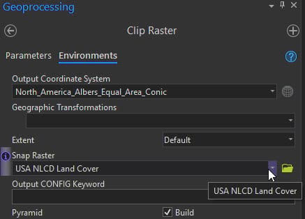 Select the Environments tab and Snap Raster to the NLCD layer again (we could use the clipped raster we just made, but I tend to snap everything to the parent raster).