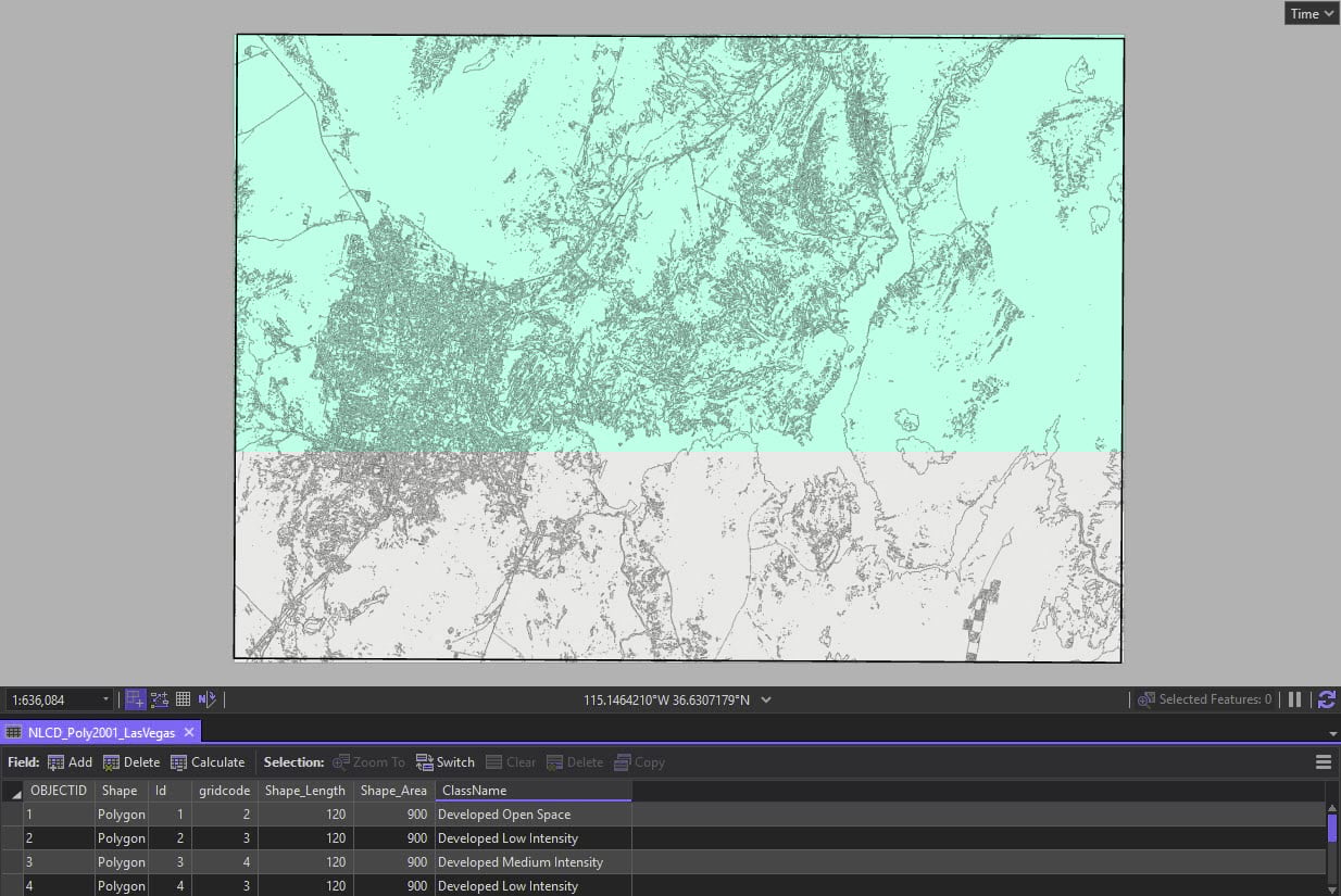 Check out the attribute table. We now have our NLCD raster values as a polygon feature class. Take note that the land cover field has been placed in a new field called ClassName.