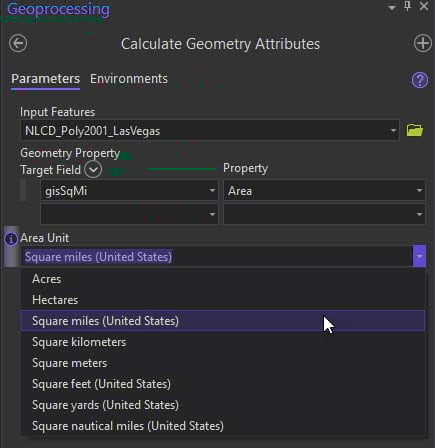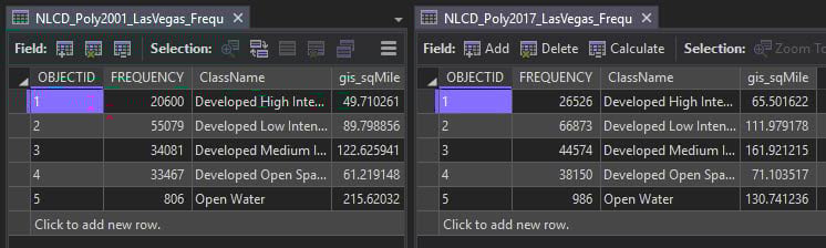 We now have two polygon feature classes, one for 2001 and one for 2017, and each have a new field calculated by square miles.