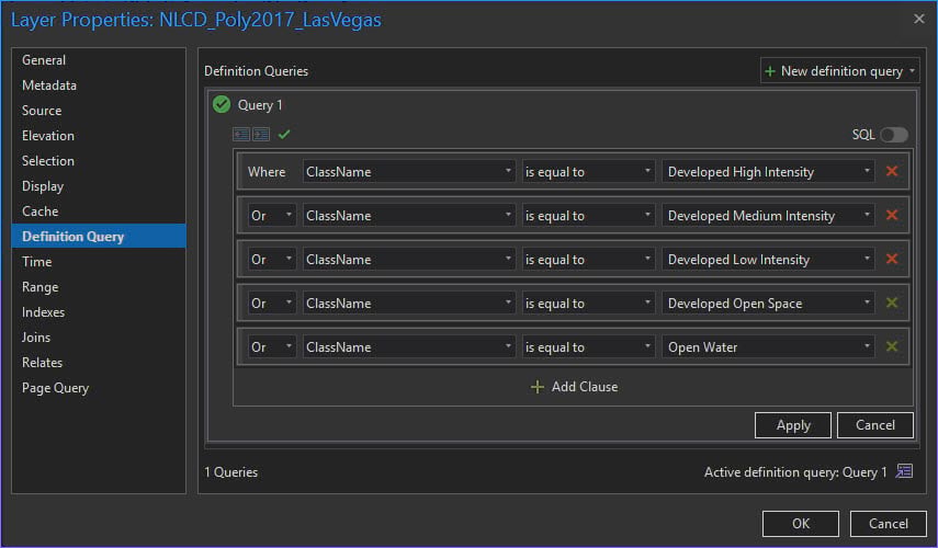 Hide all the other land cover types with a Definition Query on the 2001 and 2017 polygon feature classes so that there are only these five shown.