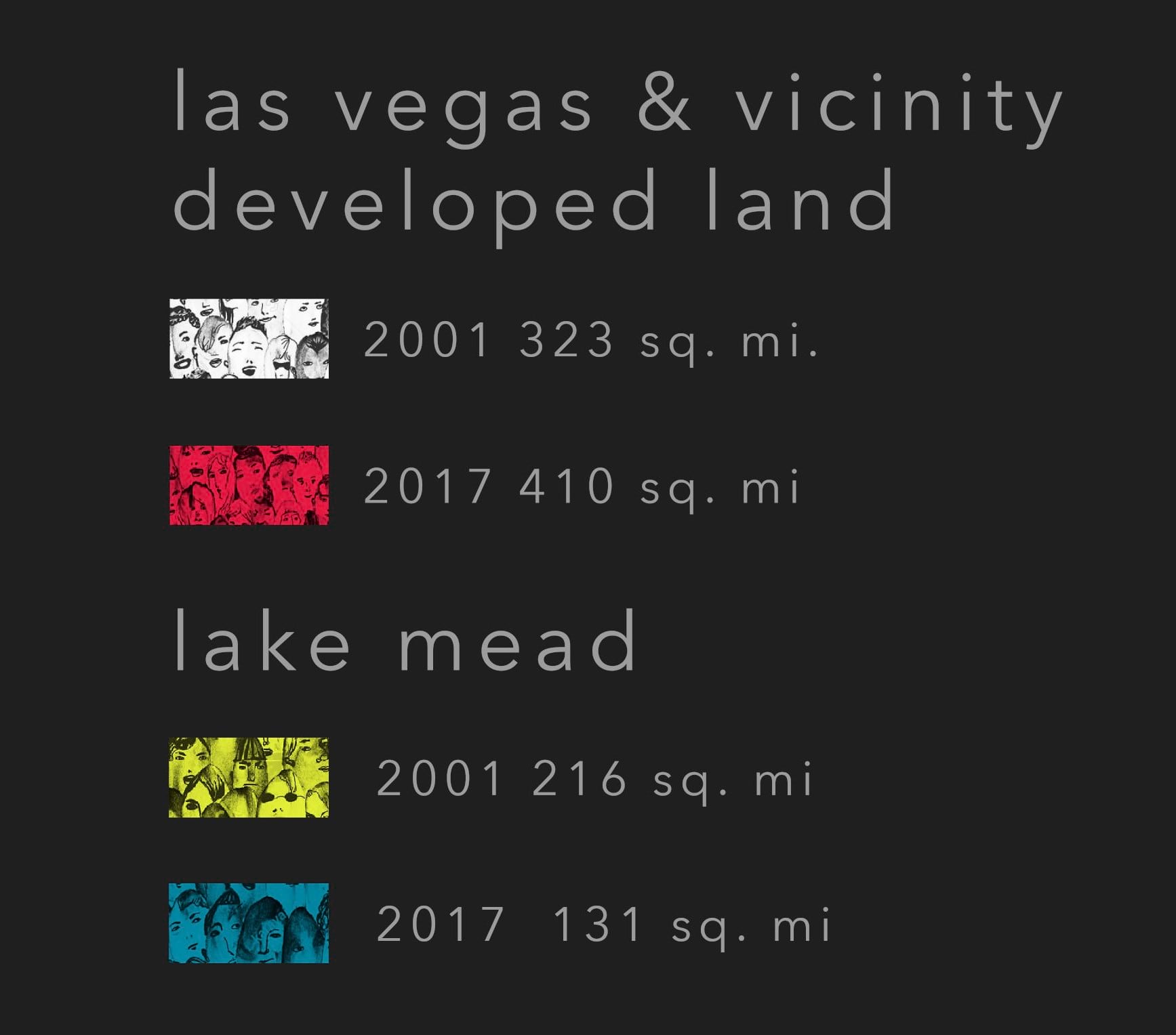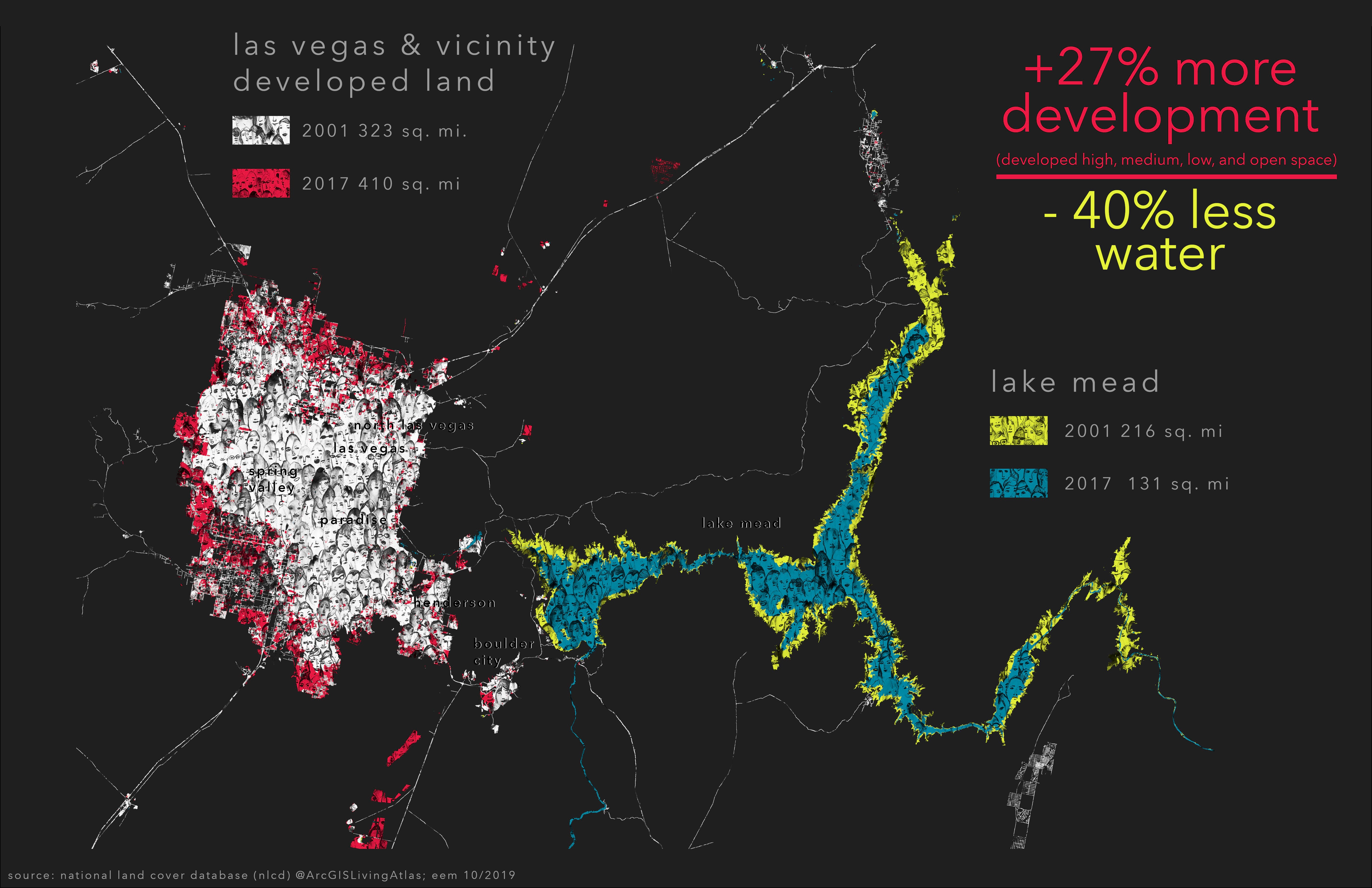 In the way that Las Vegas rises out from all that vastness, I am always struck by its geography and access to drinking water, and where that’s all coming from. Water is so precious in this landscape. Seeing it quantified in GIS like this over 16 years was remarkable.