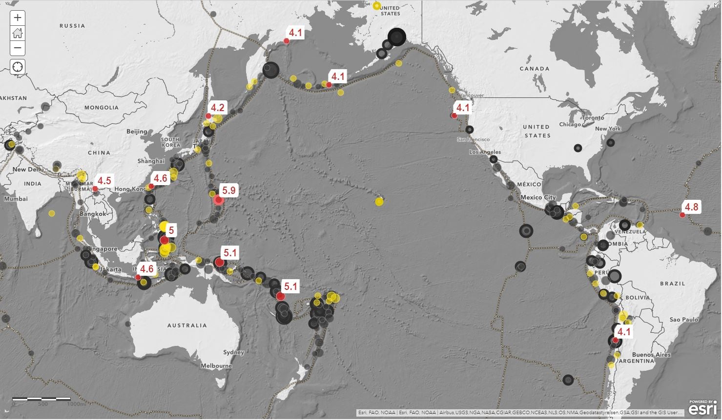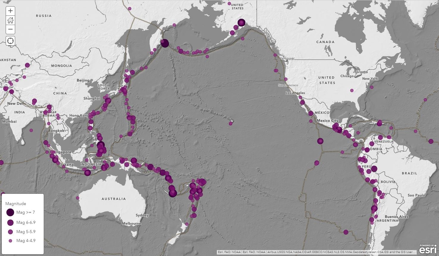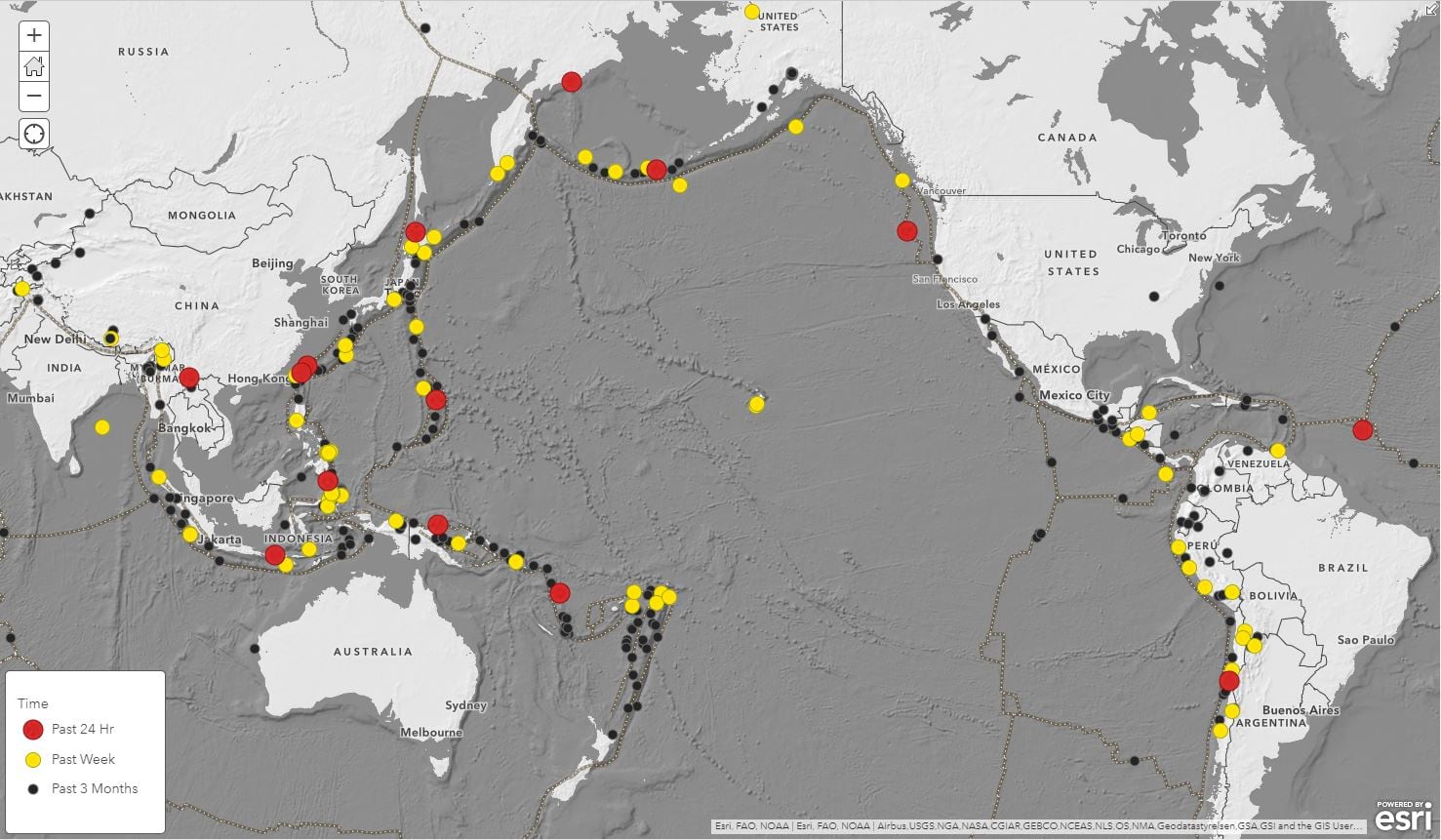 The Living Atlas of the World hosts recent global earthquakes from the U.S. Geological Survey (USGS) and their Prompt Assessment of Global Earthquakes for Response (PAGER) program.