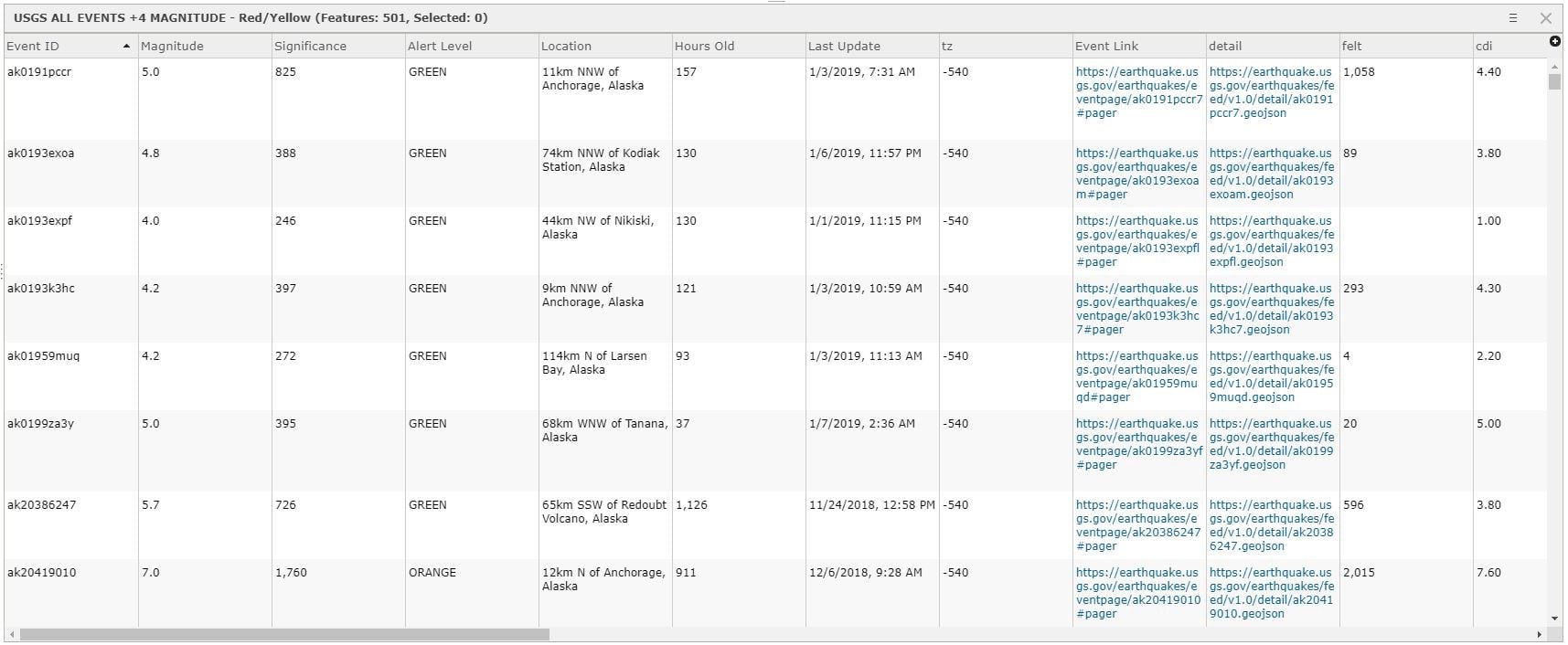 This Live Feed is updated every five minutes and has fields detailing individual earthquake information including an event’s ID, Hours Old, Magnitude, Location, and PAGER Alert Level.