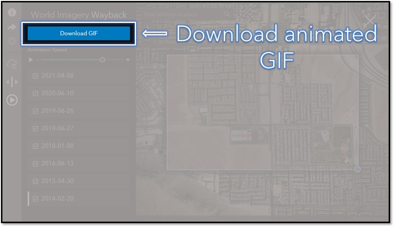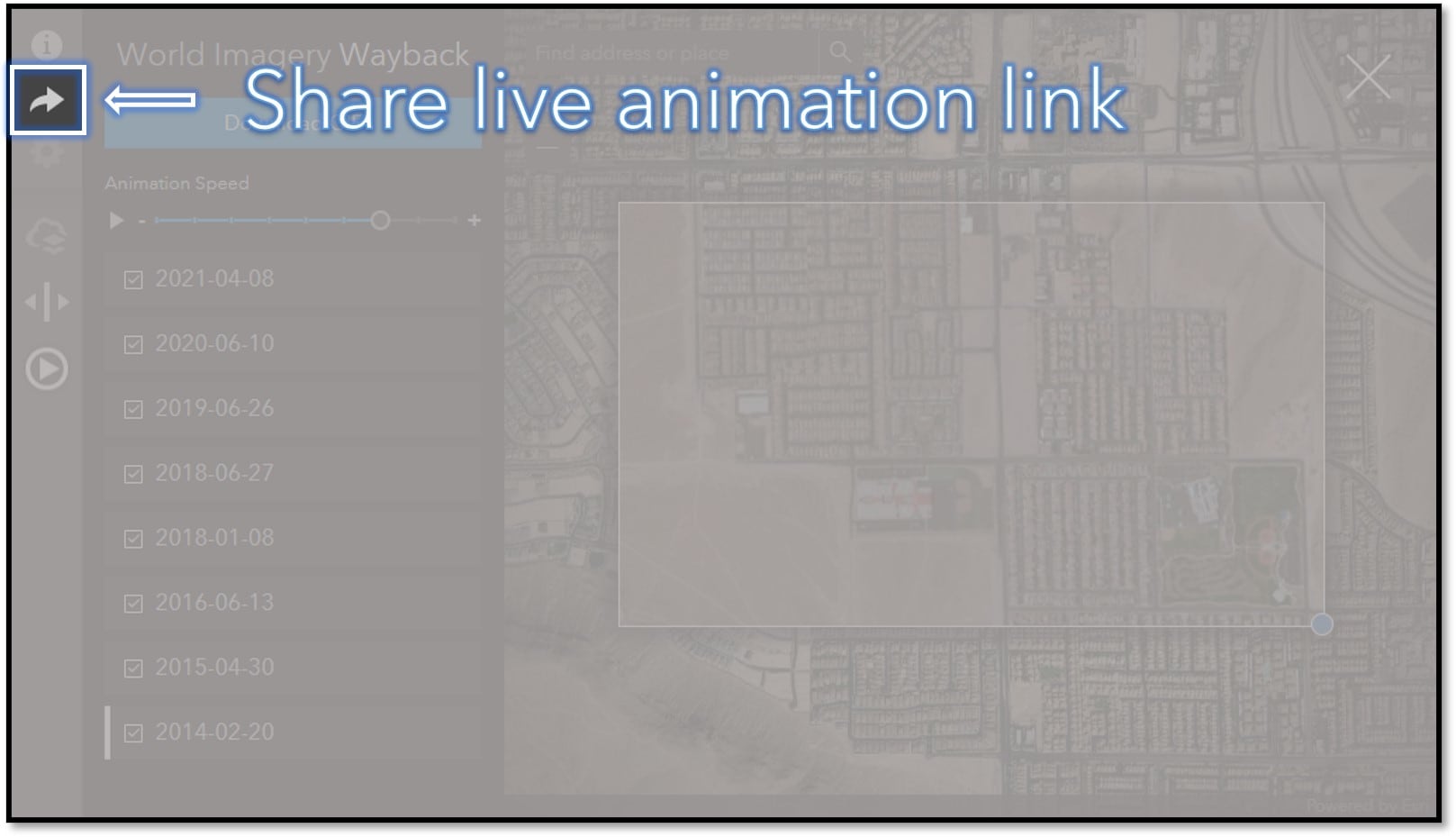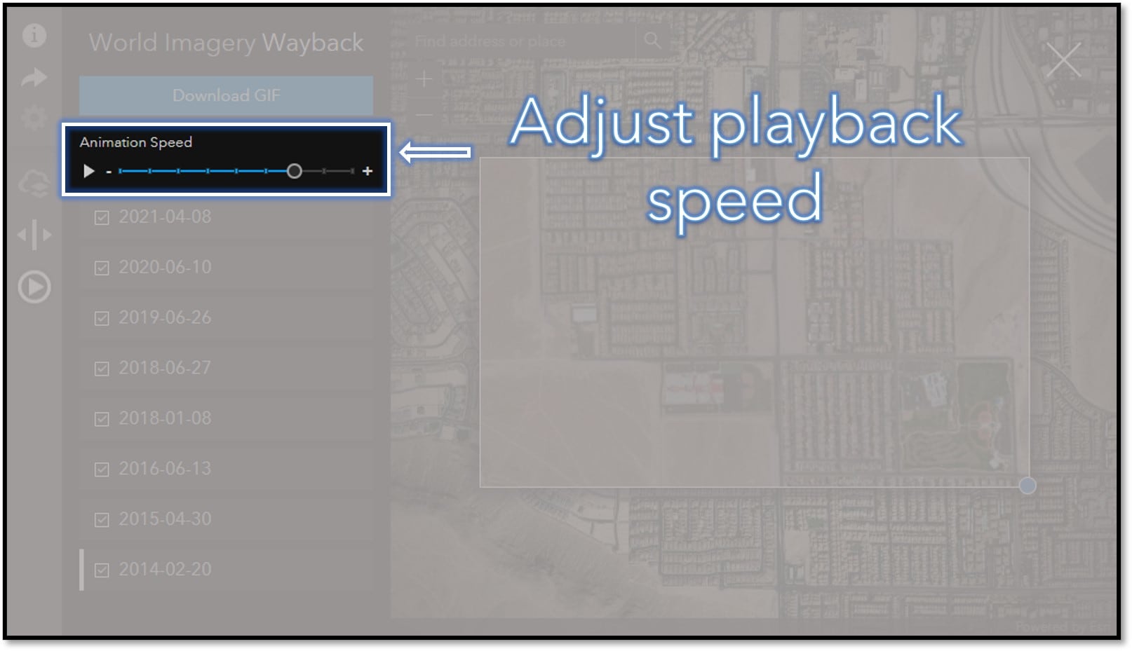 This year we are happy to introduce the new Wayback animate mode. With the click of a button, the app loads a collection of images and begins sequentially playing them back, revealing progressive changes over time. If the default settings aren’t quite quenching your visualization thirst, we have provided a simple and robust set of controls to dial things to your liking. You can control which imagery frames are displayed, you can adjust the size and location of the animation frame, and you can adjust the playback speed. For all the John Nelson minded users out there, those who really like to take things to the extreme, the speed control goes “up to eleven”…for even more frames per second! Once you are satisfied, you may choose to take the animation with you by using the provided ‘Download GIF’ option, or you might choose to share the live animation using the ‘Share’ World Imagery Wayback option. A simple set of instructions is included below.