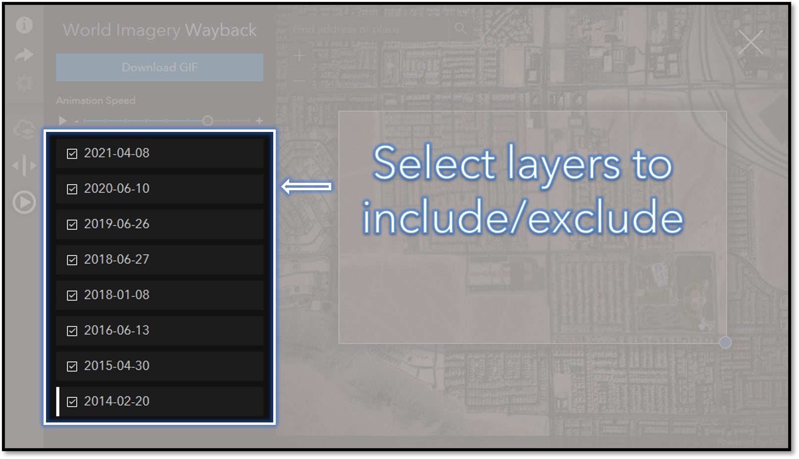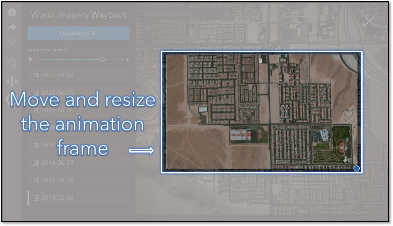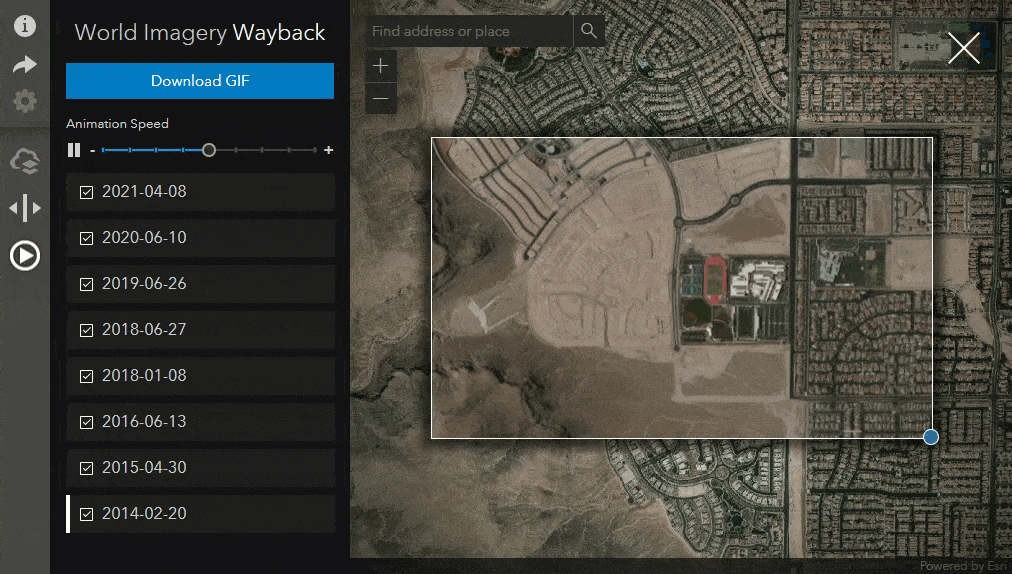 This year we are happy to introduce the new Wayback animate mode. With the click of a button, the app loads a collection of images and begins sequentially playing them back, revealing progressive changes over time. If the default settings aren’t quite quenching your visualization thirst, we have provided a simple and robust set of controls to dial things to your liking. You can control which imagery frames are displayed, you can adjust the size and location of the animation frame, and you can adjust the playback speed. For all the John Nelson minded users out there, those who really like to take things to the extreme, the speed control goes “up to eleven”…for even more frames per second! Once you are satisfied, you may choose to take the animation with you by using the provided ‘Download GIF’ option, or you might choose to share the live animation using the ‘Share’ World Imagery Wayback option. A simple set of instructions is included below.