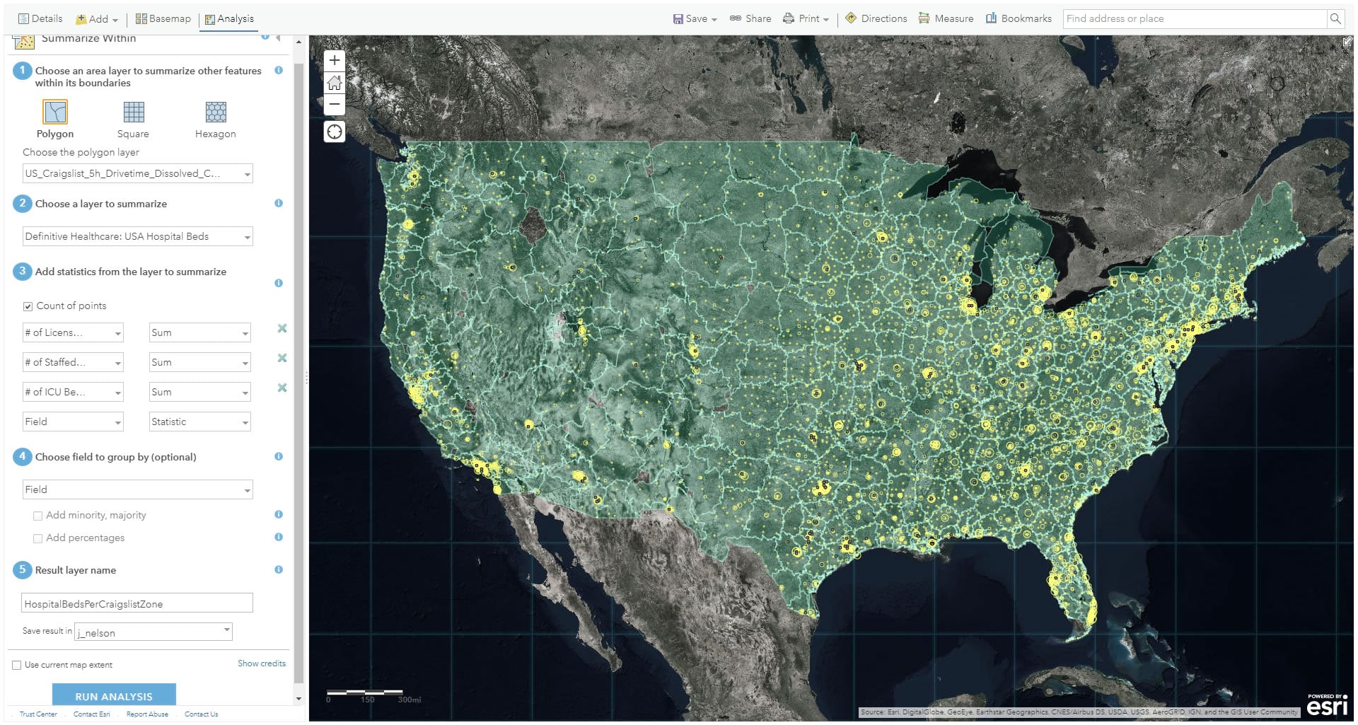 Here’s how to aggregate those hospital bed counts, living within hospital point locations, into polygons (particularly, Craigslist Zones)…