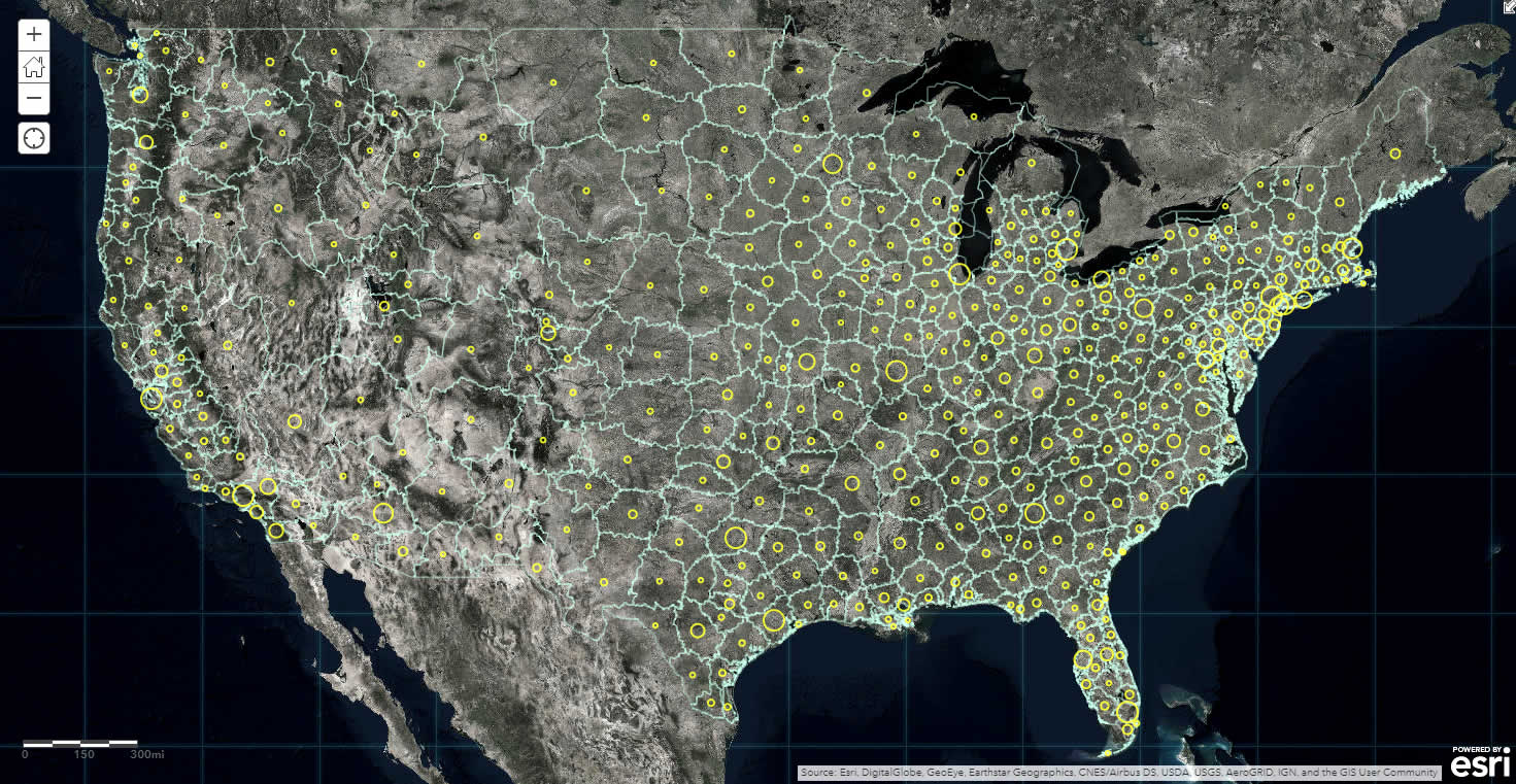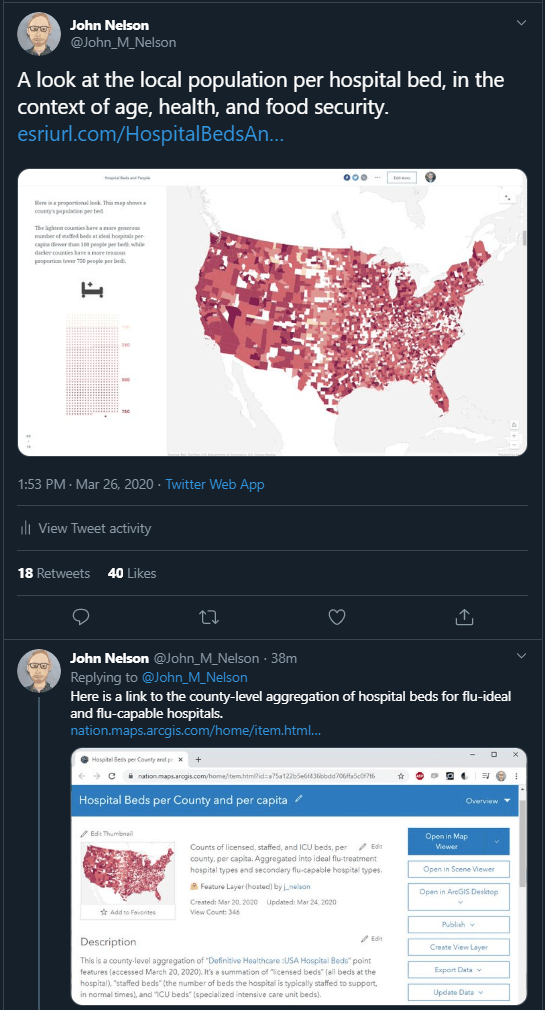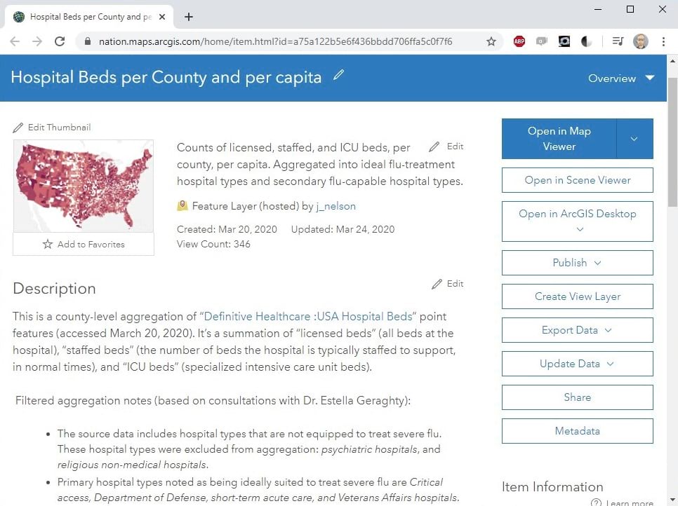 Yesterday I published a StoryMap that looks at the proportion of a county’s population that is represented by a single hospital bed. The data comes from the wonderful and generous “Definitive Healthcare: USA Hospital Beds” data that was recently shared into Living Atlas. I wanted to associate these hospital points, and their constituent bed counts, into regions that might help healthcare planners and providers, and the general public, understand the relative numbers of hospital beds in the context of the overall population (and some additional considerations like age, healthiness, and food security).
