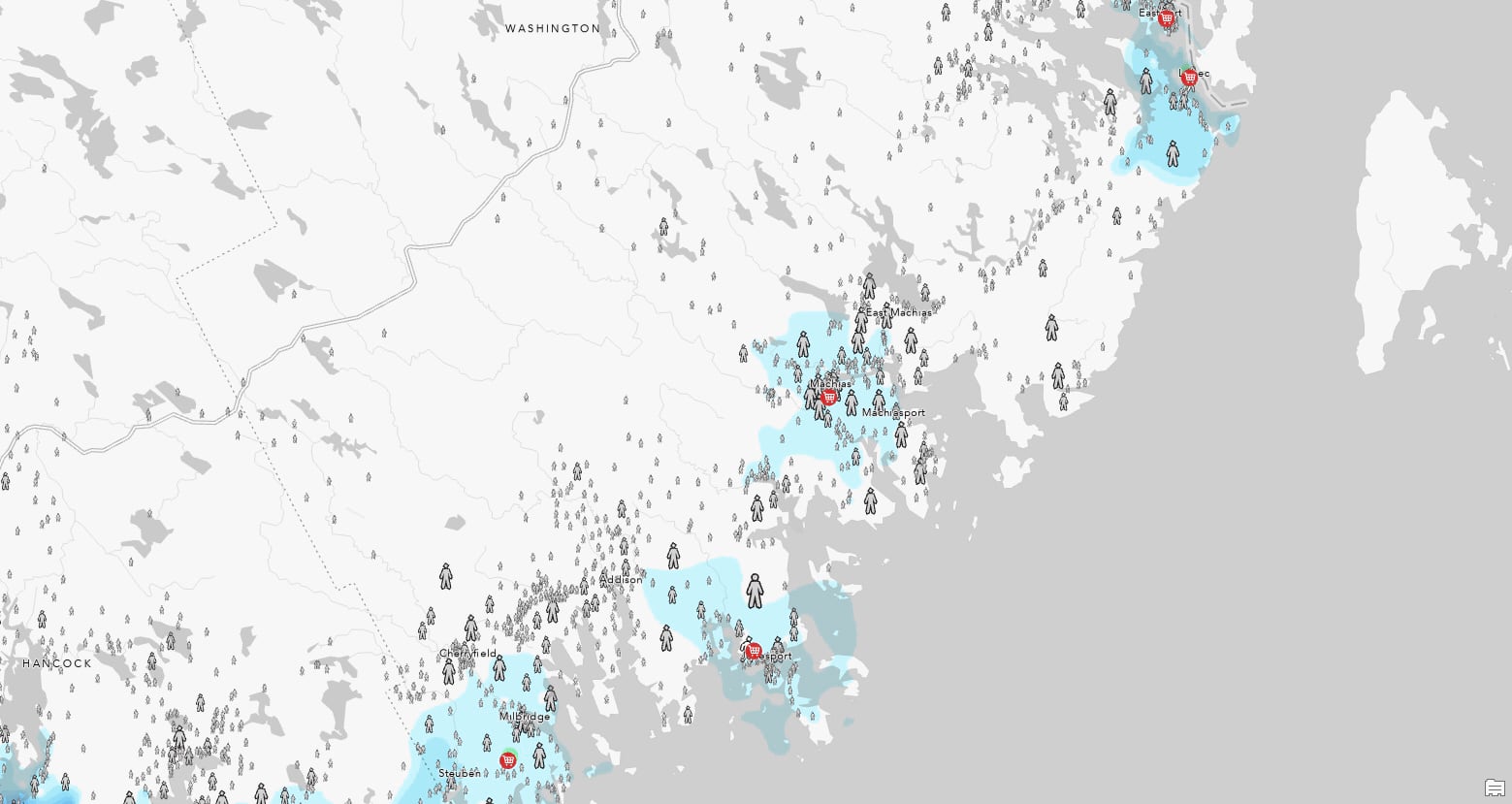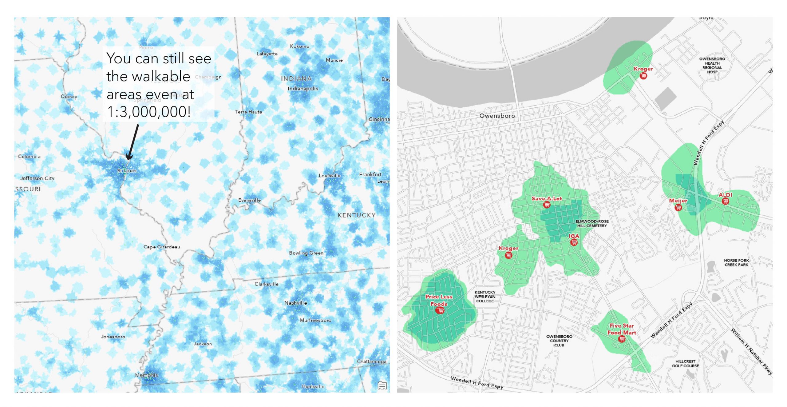 - Grocery Access web map – an example web map that brings walkable and drivable layers together with the SafeGraph store locations and Census block population data.