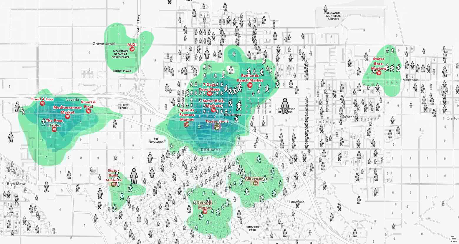 Several of the areas in Redlands that would be considered a 10-minute walk but have none or low populations within and around them. You must drive to these places.