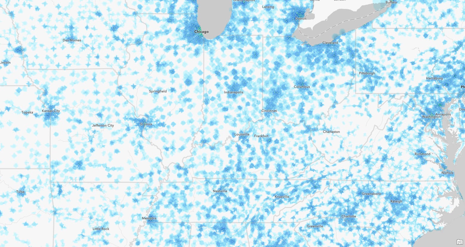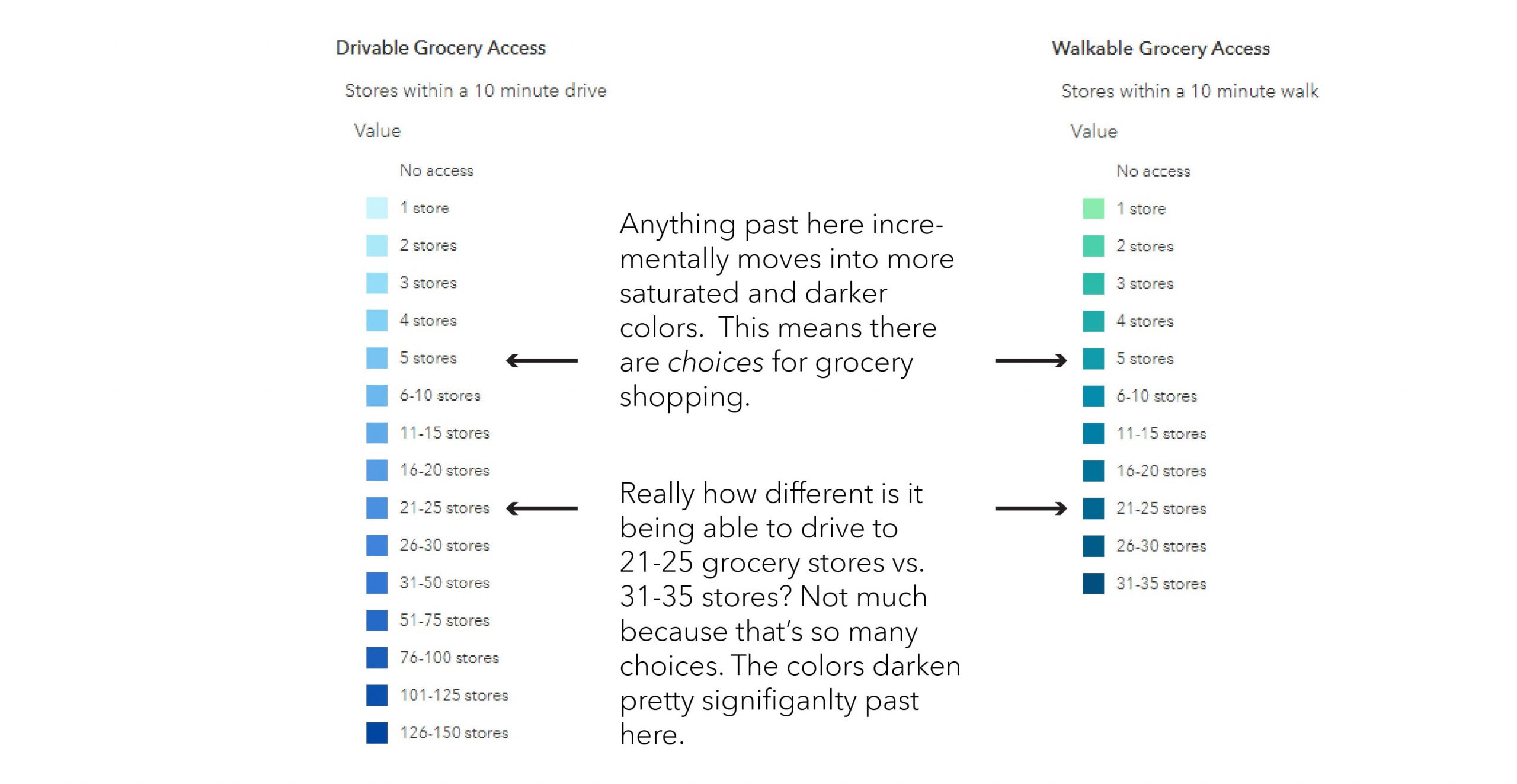 I live rural and have few grocery store choices. In fact in my town there is one main grocery store that is very important for my community. When coming up with the palette we felt that the lowest possible value “One store within a 10-minute drive” should mimic the fragility aspect of only having only one grocery store around. We built that into the map story by selecting a light-almost-fading-away-blue. This way it’s present, but not distracting. It intensifies in color around the cities but nowhere on the map does it take over. All values are represented equally yet rank is implied.