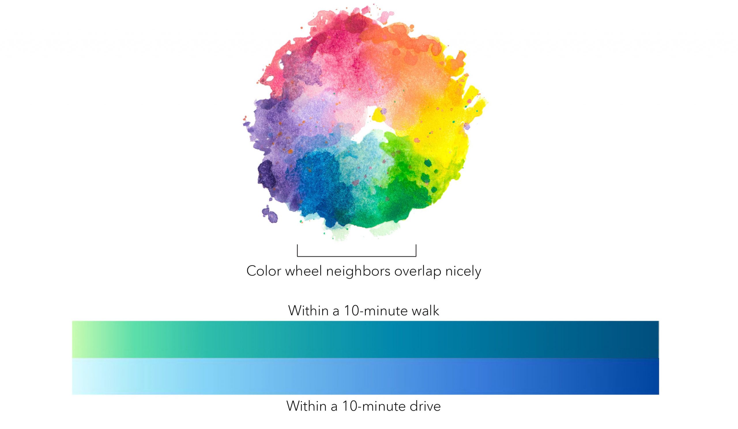 It was actually the lowest value “One store within a 10-minute drive” that carried the most weight or presence as it’s found all over the map at every scale. Since it’s the predominant value the color must be liked a lot and I mean A LOT because it sets the map tone and will overpower the story if not treated with care.